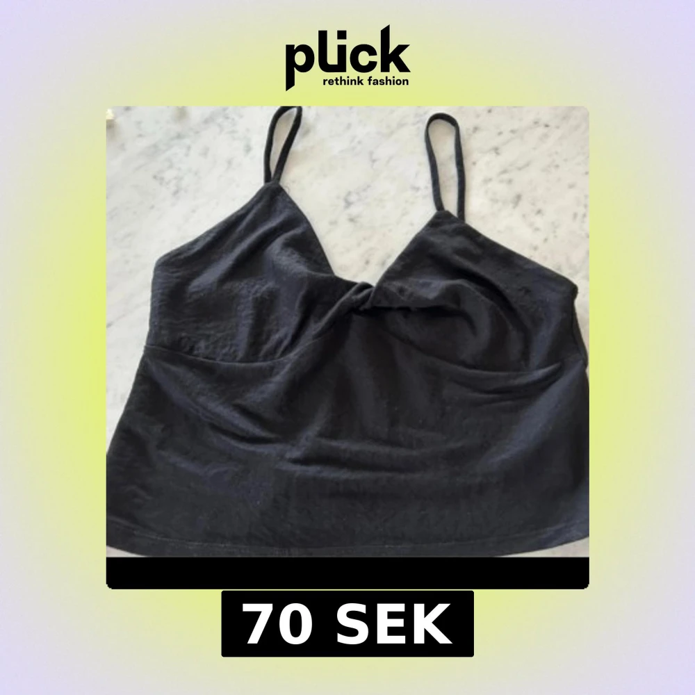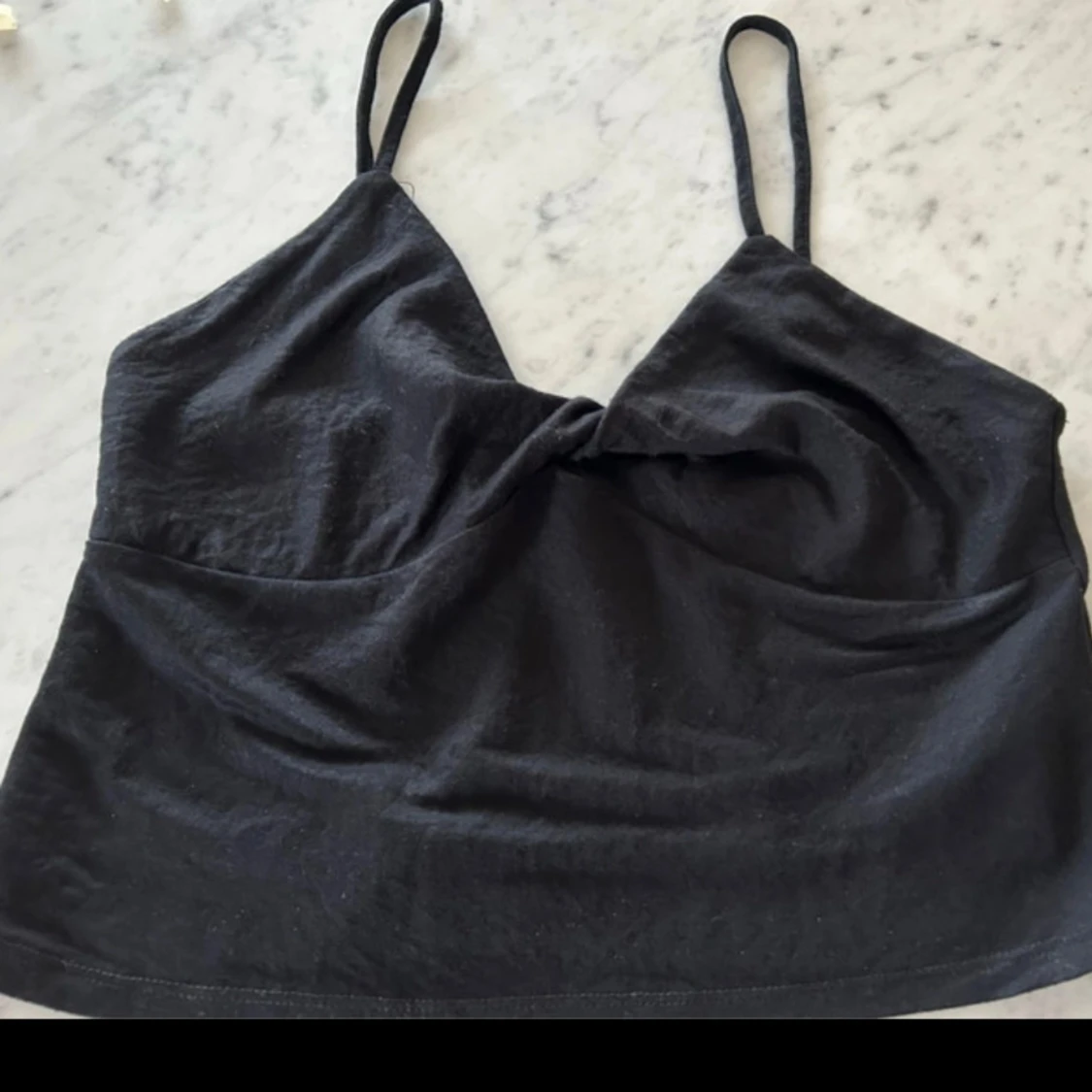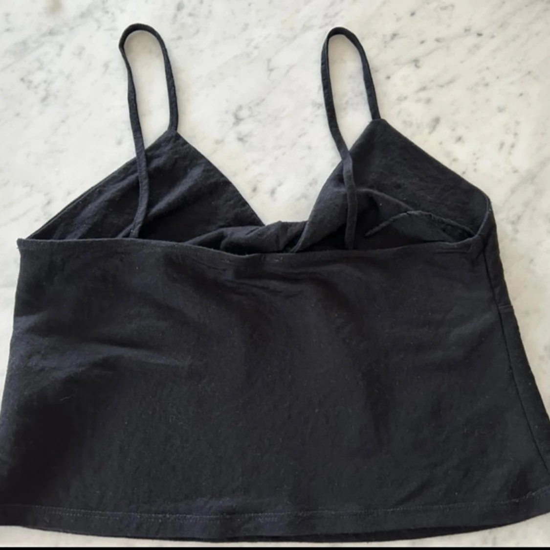 Säljer en svart linnetopp med smala axelband och snygg twist-detalj framtill. Toppen har en enkel, croppad passform och är perfekt för att styla med jeans eller kjol. Mjuk och lätt i materialet, perfekt för varma dagar.