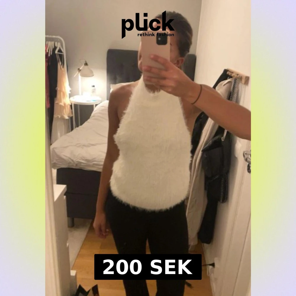Superfin vit halterneck topp från Zara i storlek L men passar en M också, Toppen har en fluffig och mjuk pälsliknande yta som ger en unik och cool vibe. Modellen är ärmlös och har en hög hals som knyts i nacken.