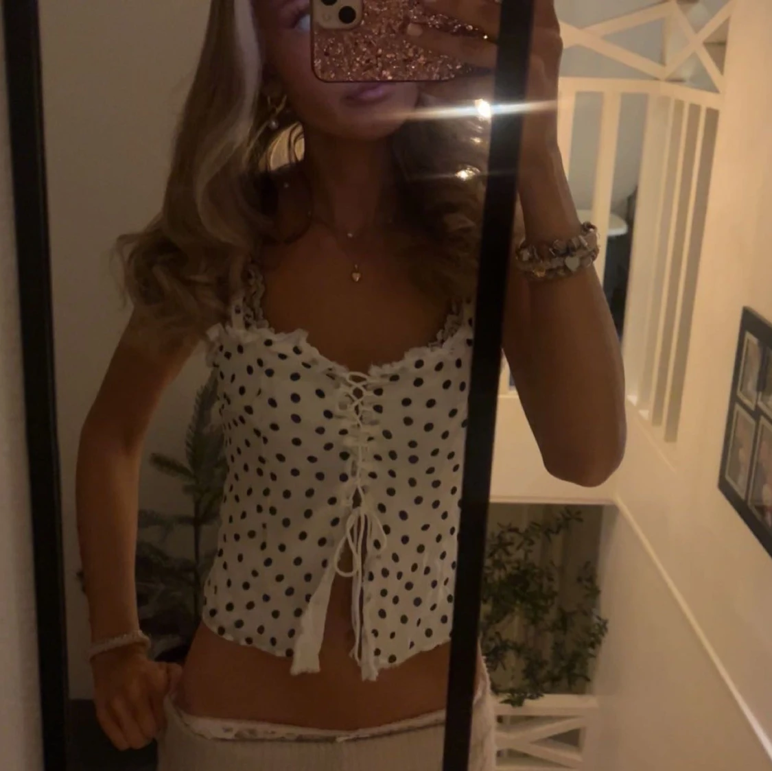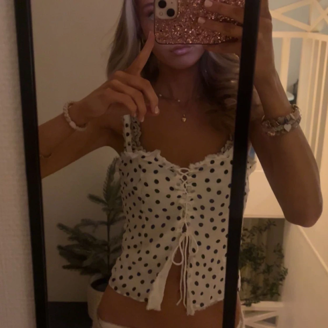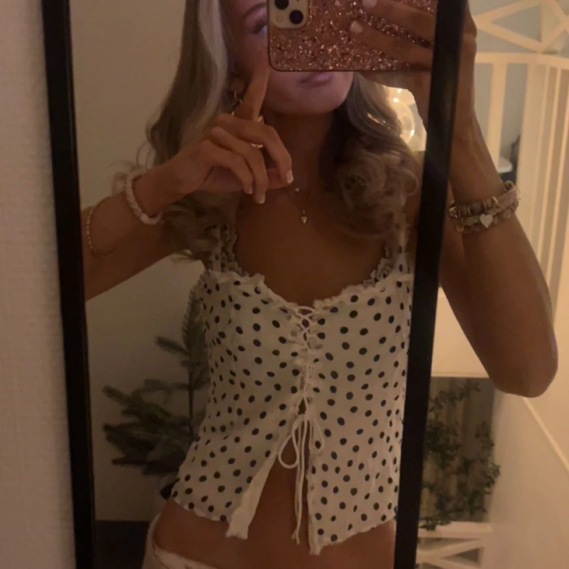 Säljer en söt vit topp med svarta prickar och snörning framtill. Perfekt till fest och sommaren!!.💓💓💓