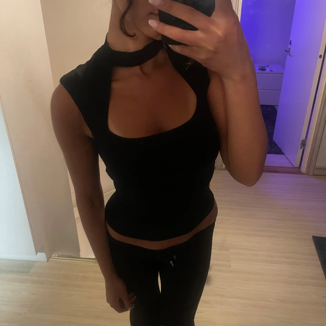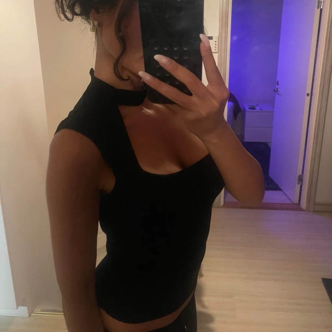 Säljer en svart, tight topp med unik asymmetrisk design och choker runt halsen. Toppen är ärmlös och har en modern, stilren look som passar perfekt till trendiga outfits.