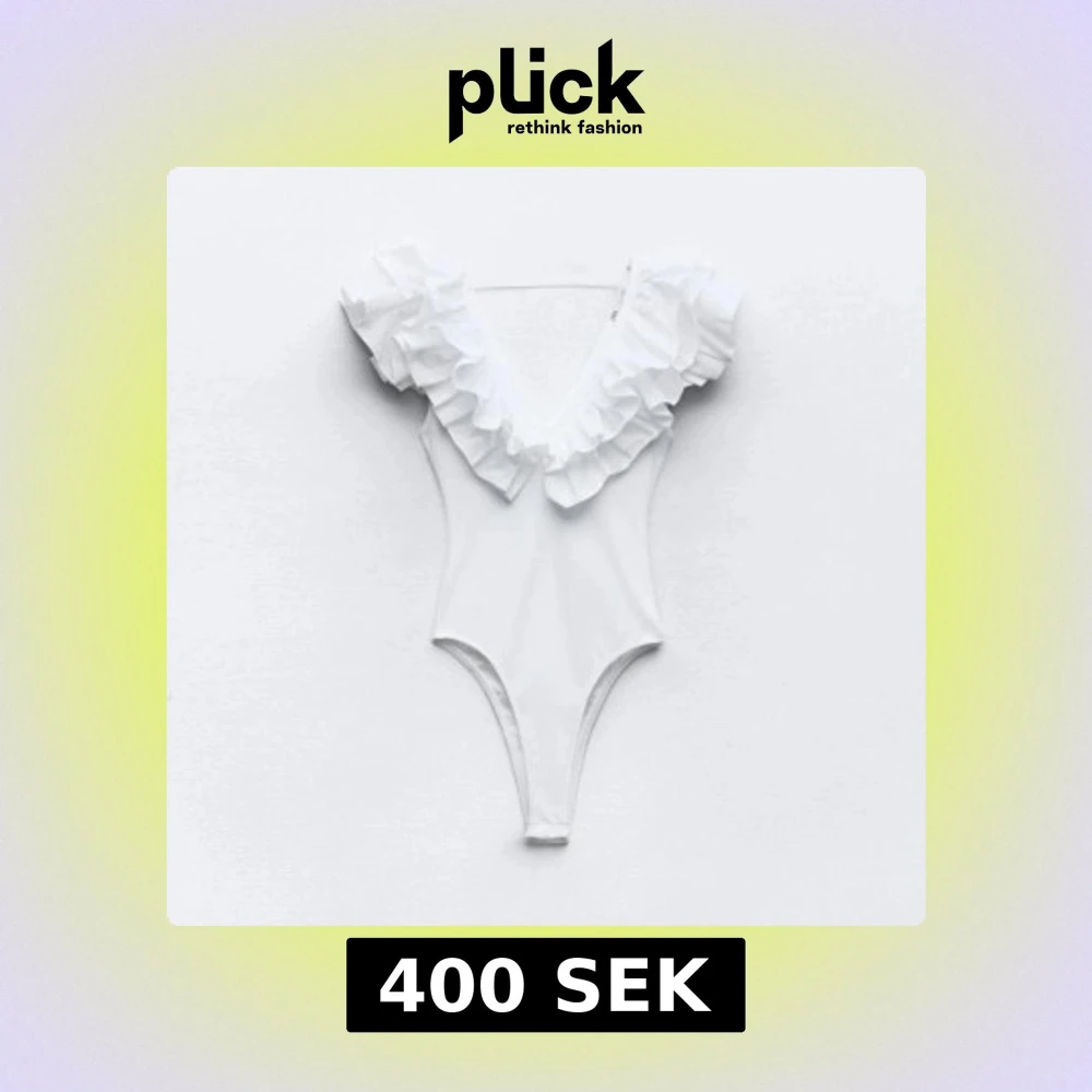 Säljer en stilren vit ribbad body med volangdetaljer vid axlarna. Den har en djup v-ringning. Passar bra till både jeans och kjol. Köpt här på plock (förra säljarens bilder).