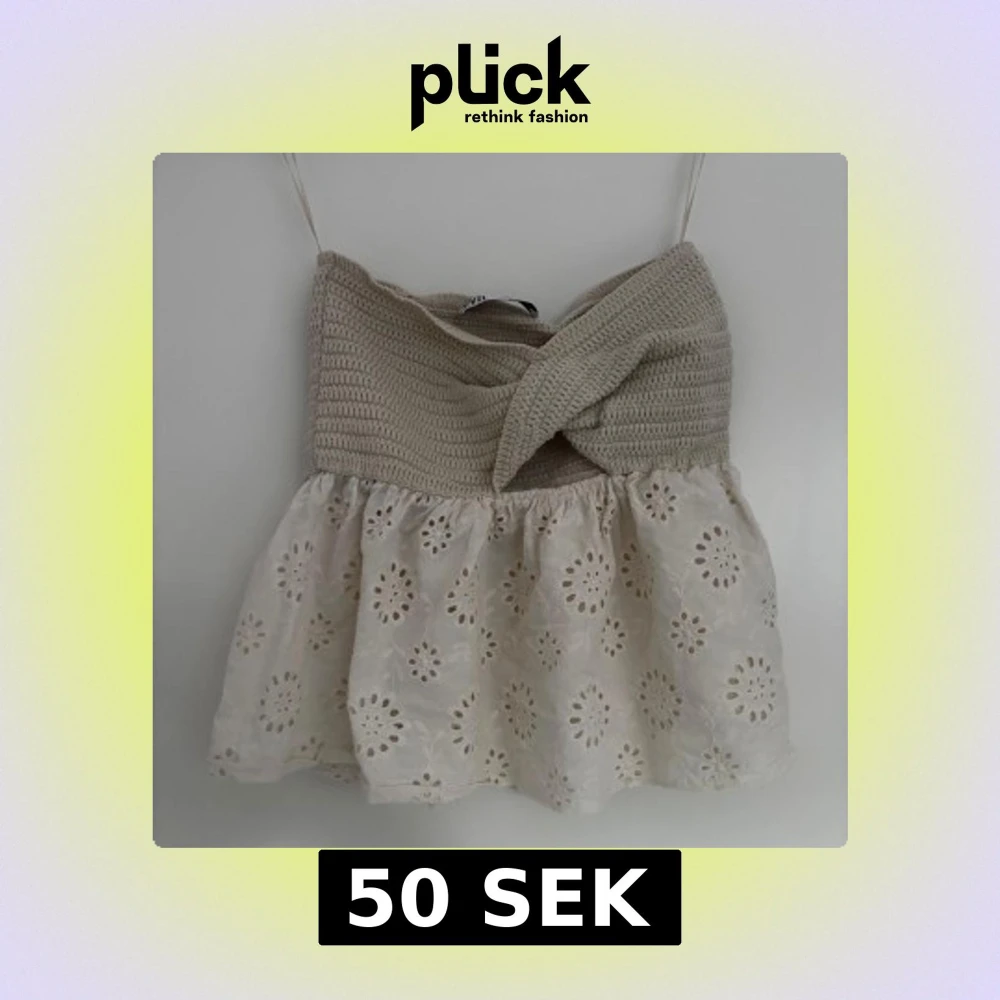 Supersöt croppad topp med virkad beige överdel och broderad, vit spets nertill. Smala axelband och omlott-detalj framtill. Perfekt för varma dagar och ger en romantisk vibe.