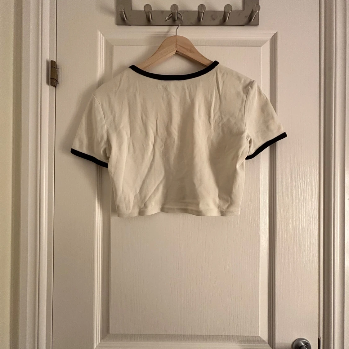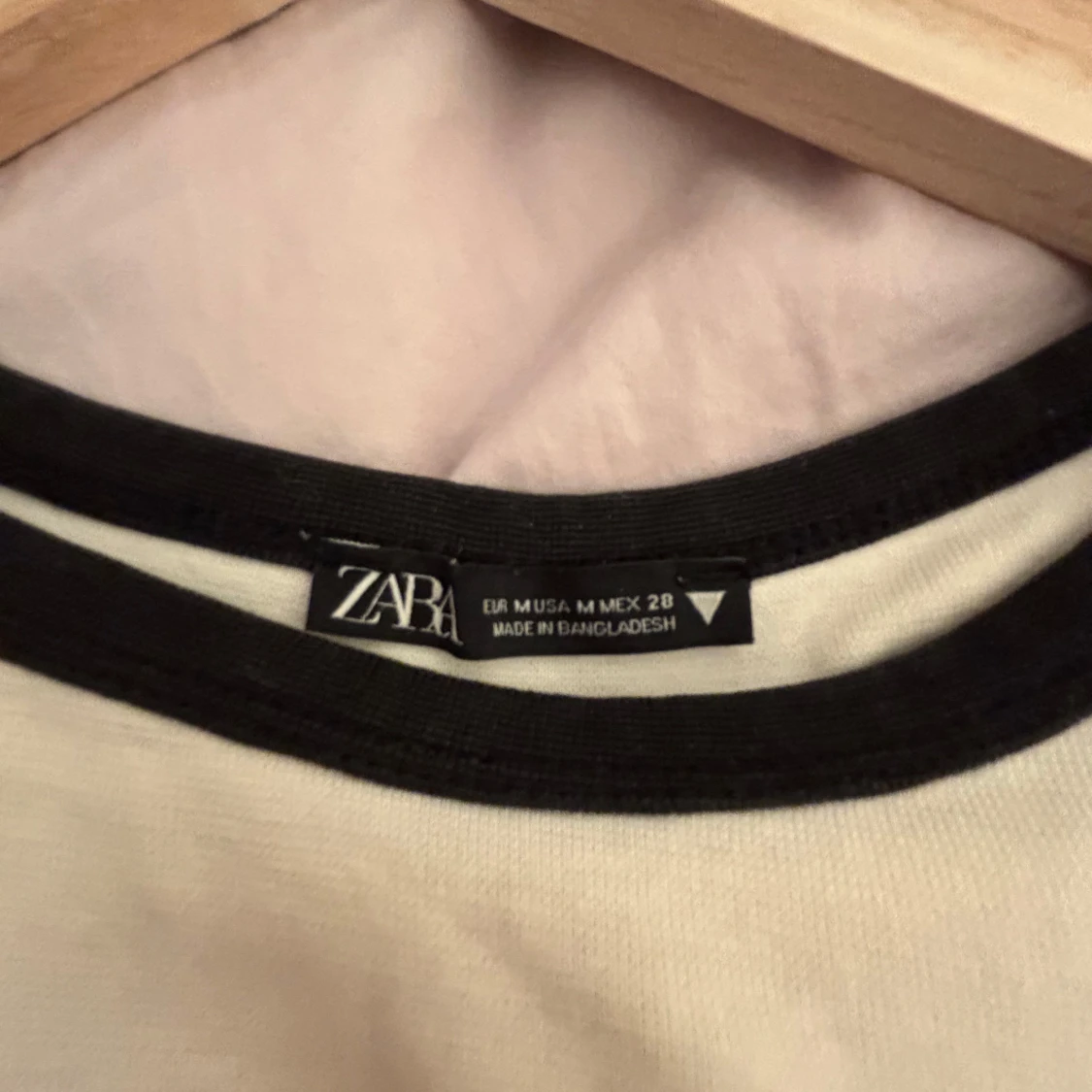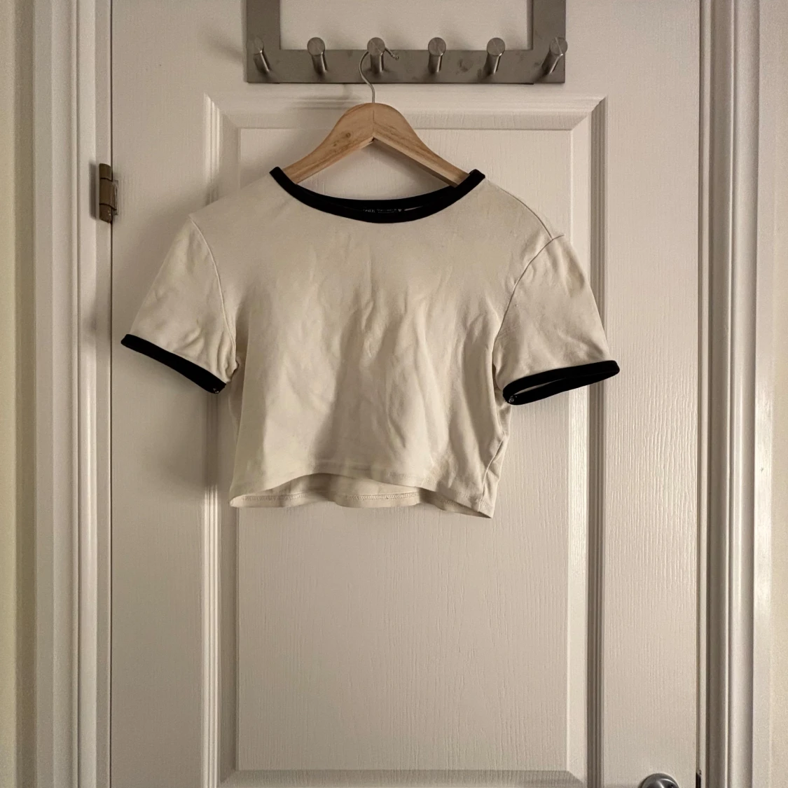 Säljer en vit croppad t-shirt från Zara med svarta kanter vid hals och ärmslut. Perfekt för en avslappnad stil. T-shirten har korta ärmar och en enkel design.