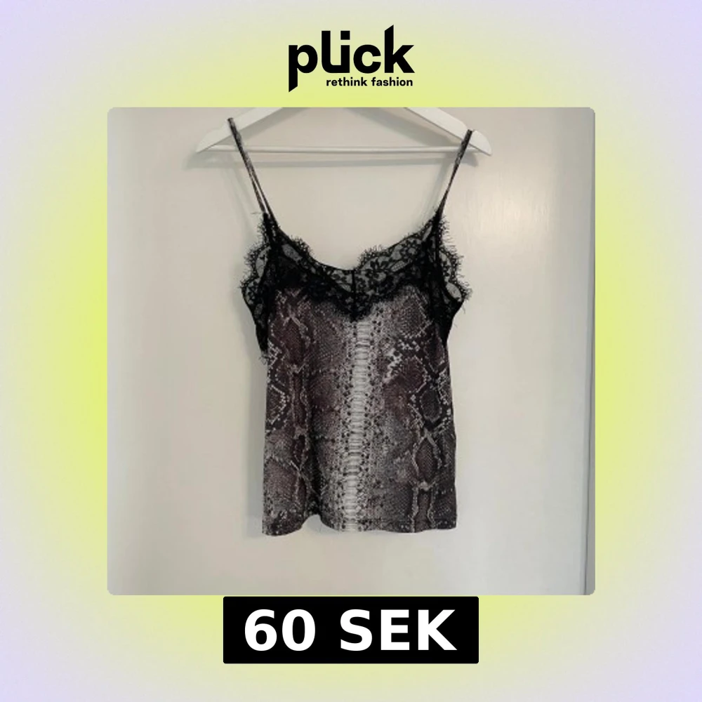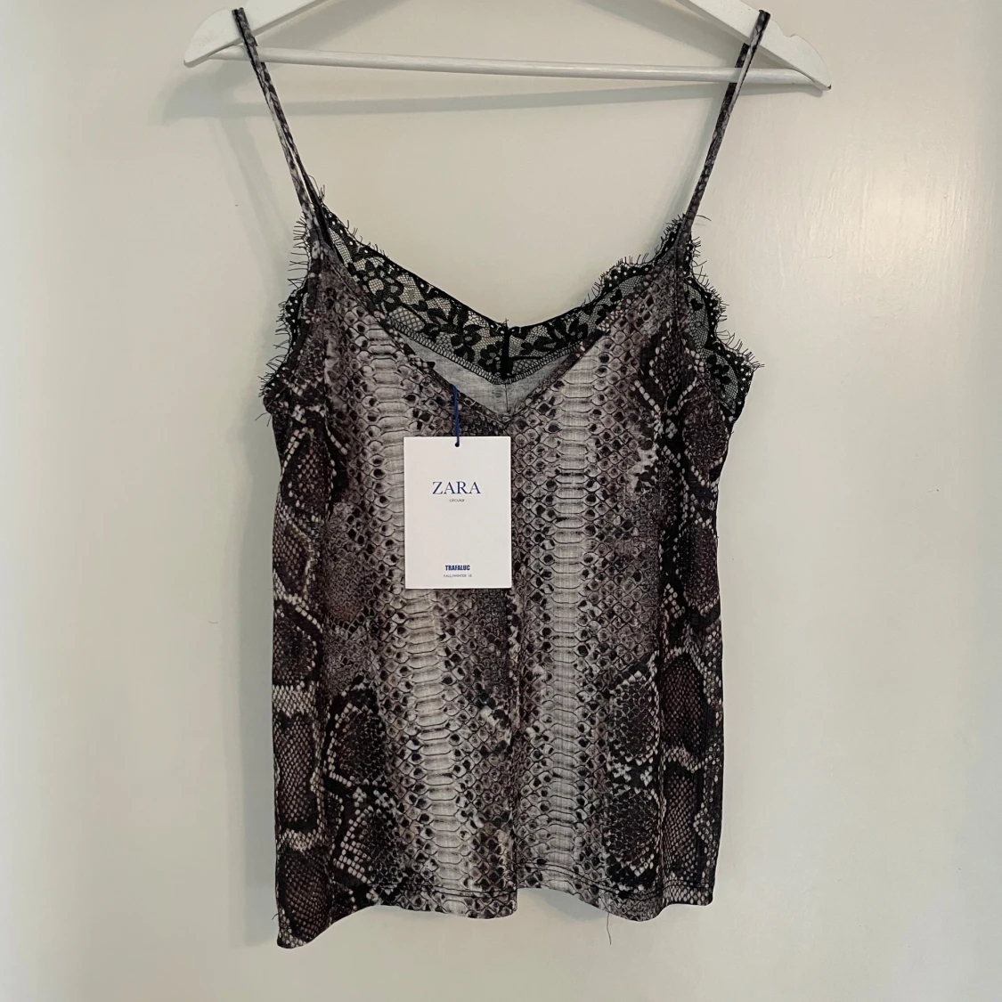 Supersnygg linne från Zara med ormmönster i mörka och ljusa toner. Toppens tunna axelband och v-ringning är dekorerade med svart spets som ger en edgy vibe. Perfekt att styla med jeans eller kjol för en cool look.