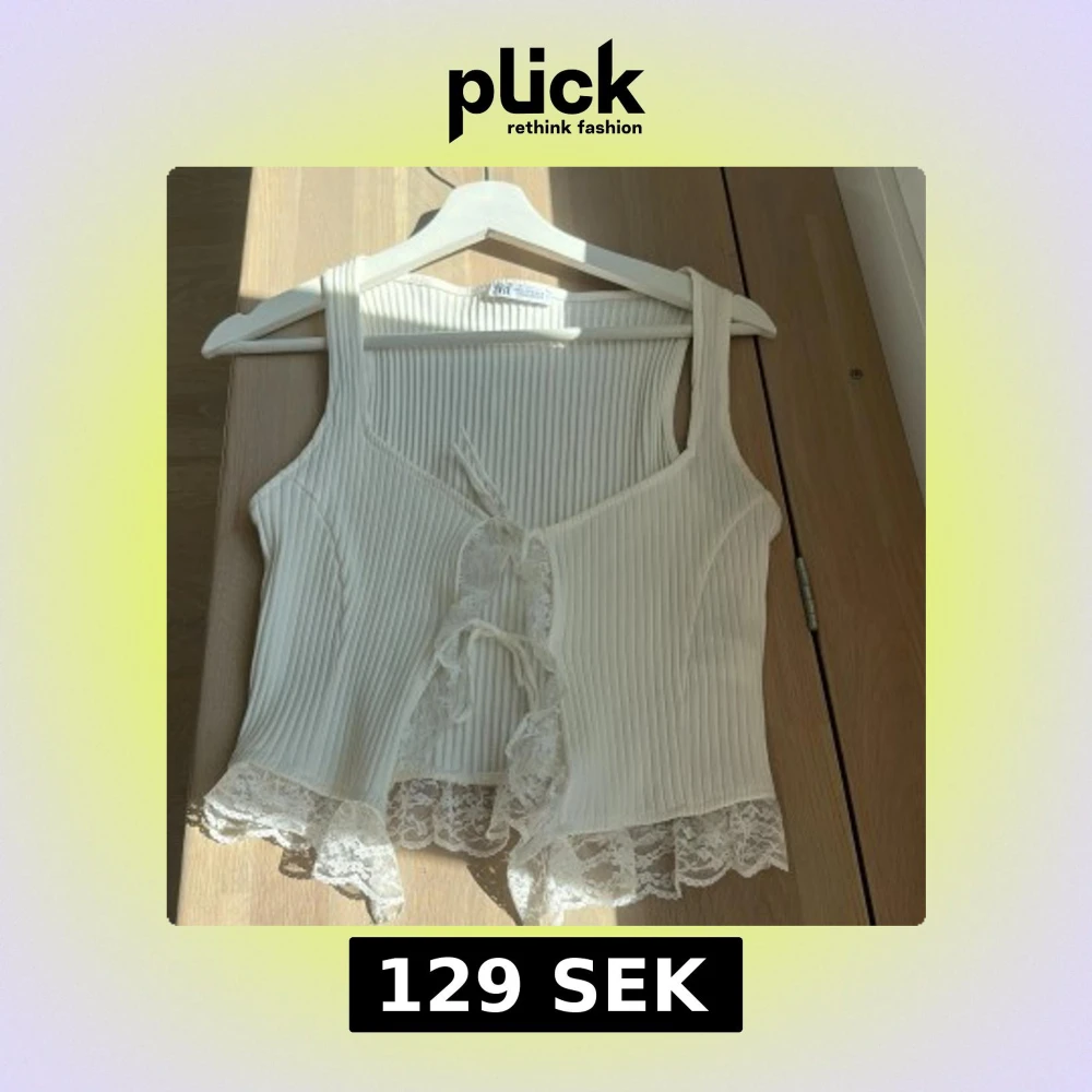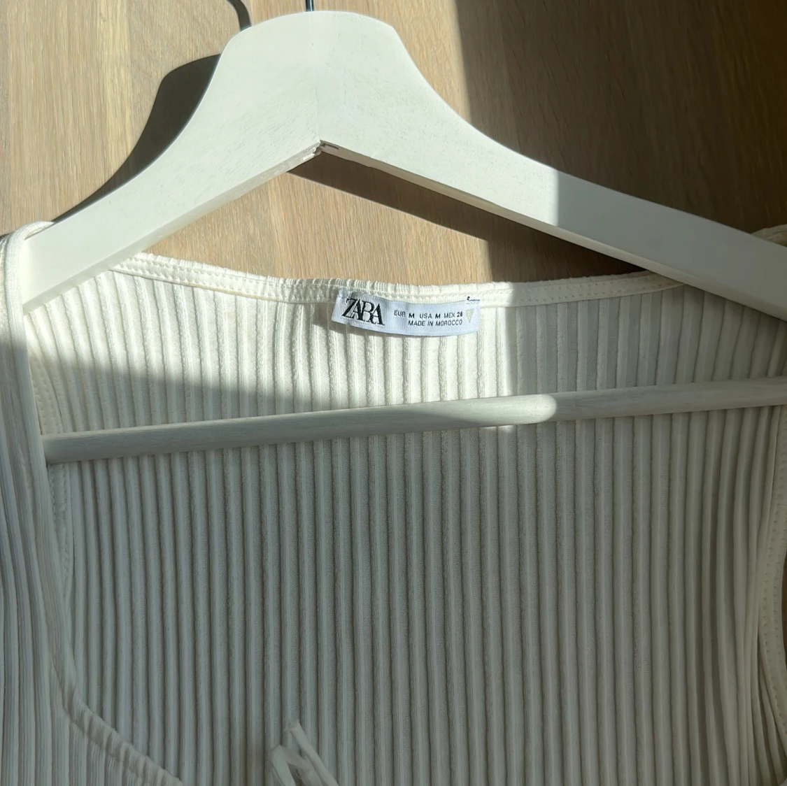 Supersöt vit ribbad linnetopp från Zara med spetskant nertill och snörning framtill. Toppen är ärmlös och har breda axelband. Perfekt för dig som gillar romantiska detaljer och vill ha en feminin look.