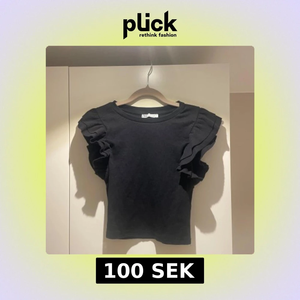 Säljer en stilren svart topp från Zara med volangdetaljer på ärmarna. Toppen har en ribbad struktur och korta ärmar som ger en trendig look. Perfekt för att piffa upp din garderob!