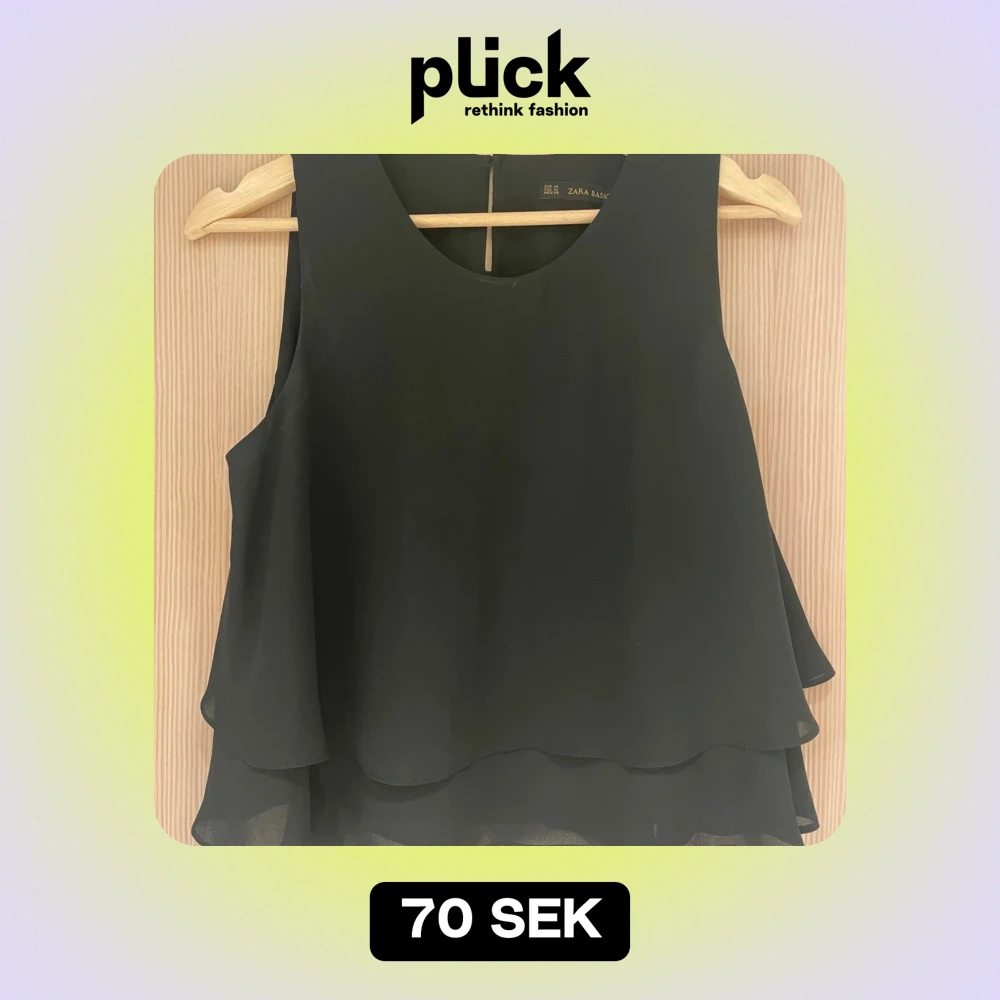 Snygg och svart ärmlös volang topp från Zara. Säljer då den tyvärr inte kommer till användning. Köparen står för frakt.