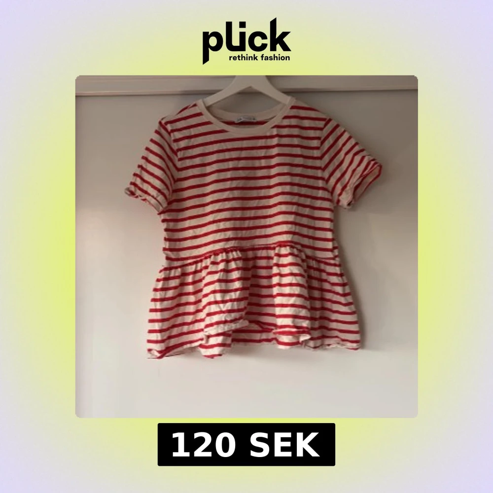 Superfin blus från Zara med röda och vita ränder. Modellen har korta ärmar, rund halsringning och en volangkant nedtill som ger en söt och avslappnad look. Tillverkad i mjuk bomull, perfekt för vår och sommar.