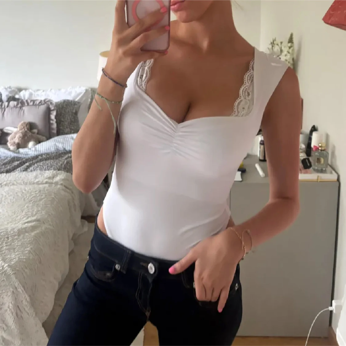 Säljer en vit croppad body med breda axelband och lätt rynk vid bysten. Bodyn har en djup, rundad urringning och är figurnära i modellen. Perfekt för en stilren och enkel look. Storlek M men skulle säga att den sitter som en S.