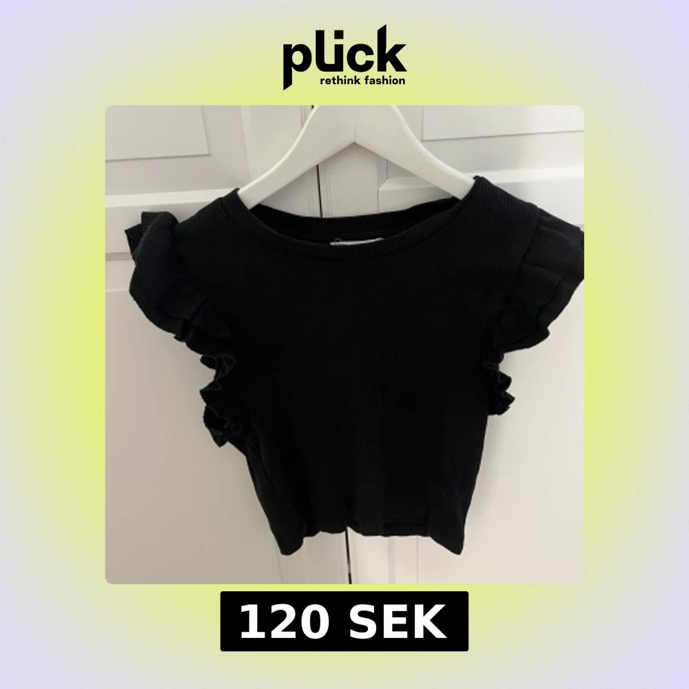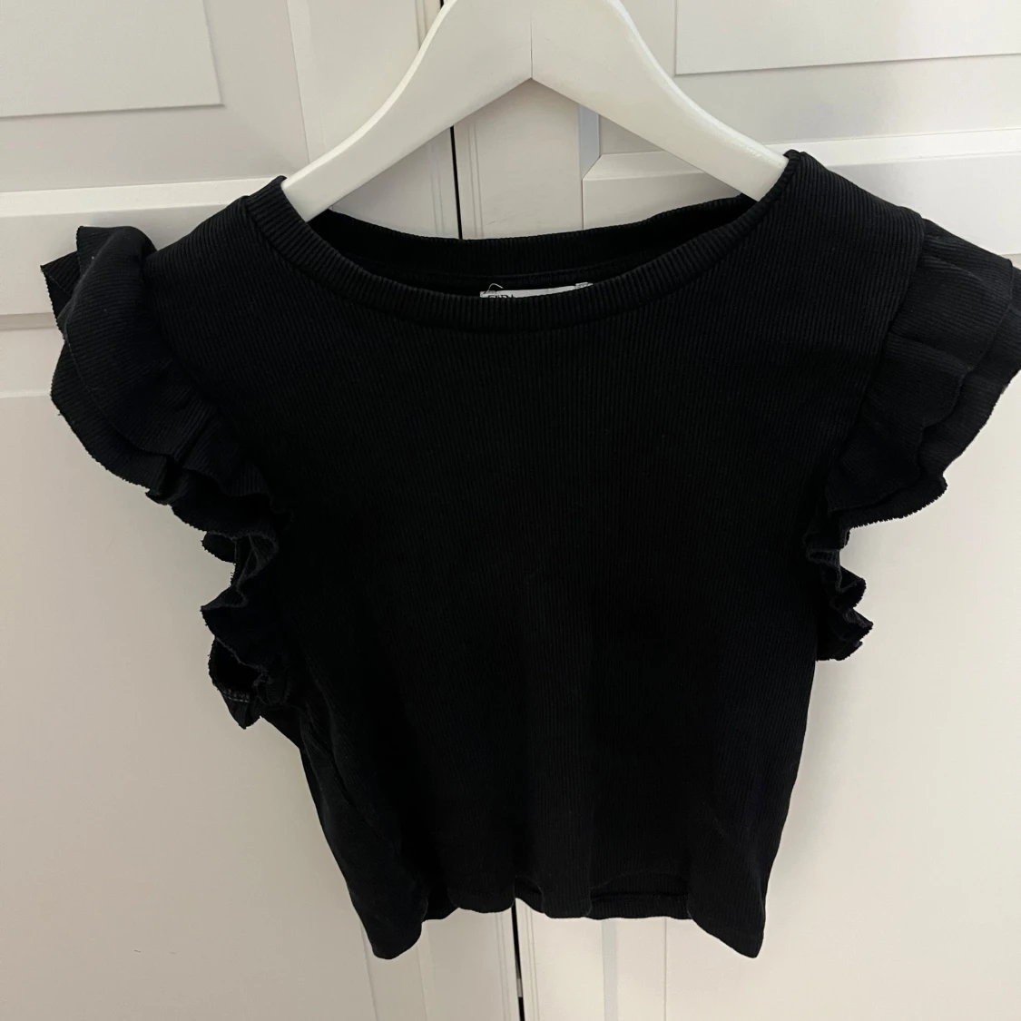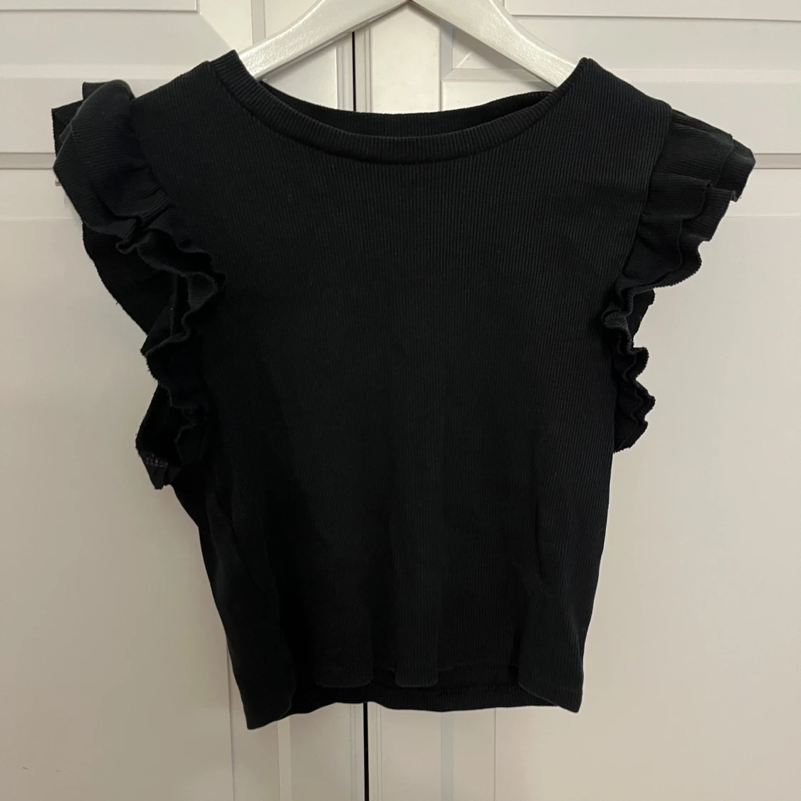 Snygg svart ribbad topp med volangdetaljer på axlarna. Modellen är ärmlös och har en rund halsringning. Perfekt att styla med jeans eller kjol för en trendig look. Säljer då den inte passat mig längre.💞