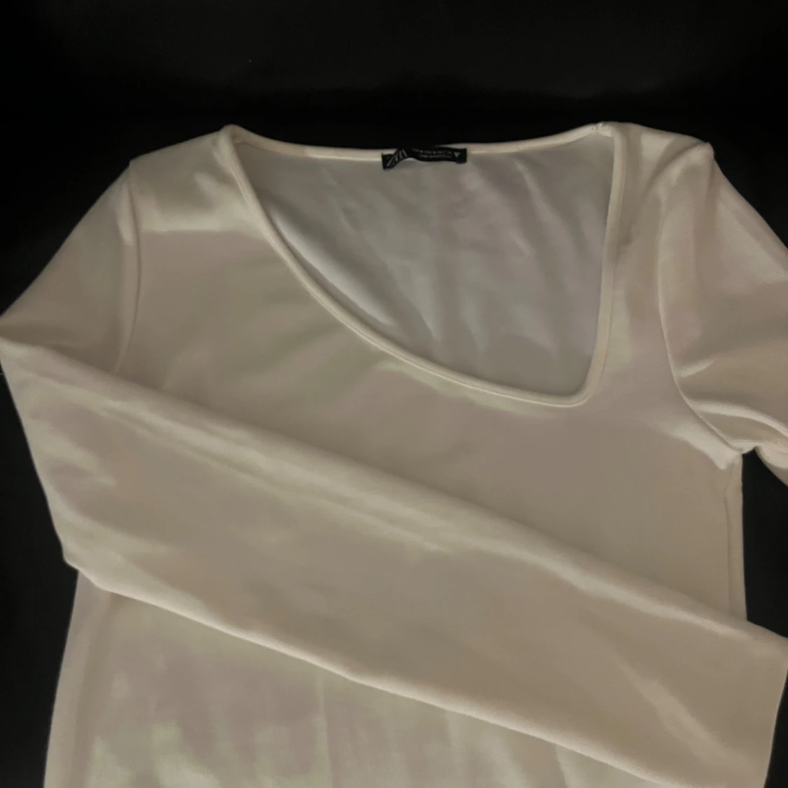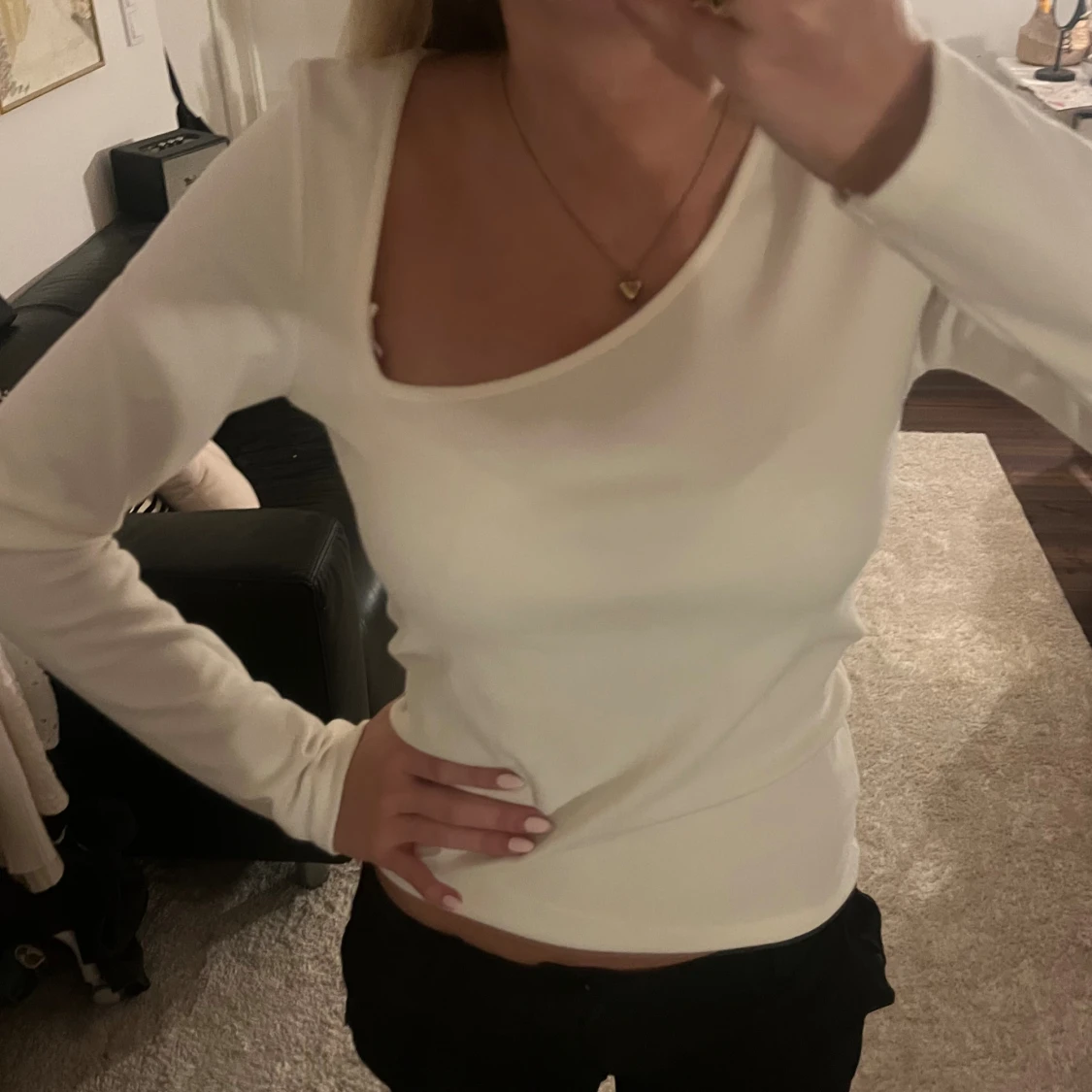 Säljer en vit långärmad topp från Zara med en cool asymmetrisk halsringning.