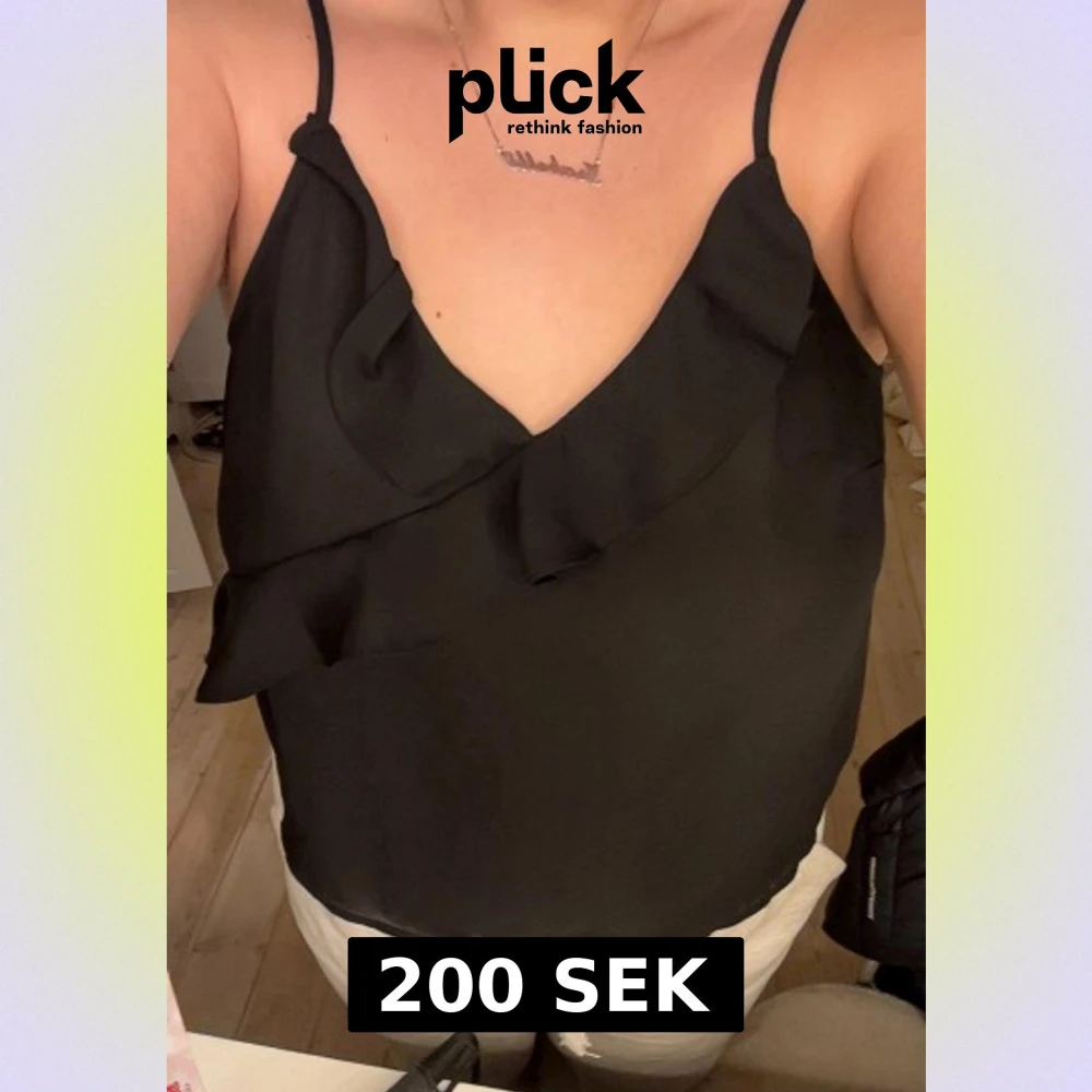 Säljer en svart linnetopp med smala axelband och snygg volangdetalj framtill. Toppen har en djup v-ringning och är tillverkad i ett lätt, mjukt material som ger en skön känsla. Perfekt för dig som gillar stilrena och trendiga plagg.