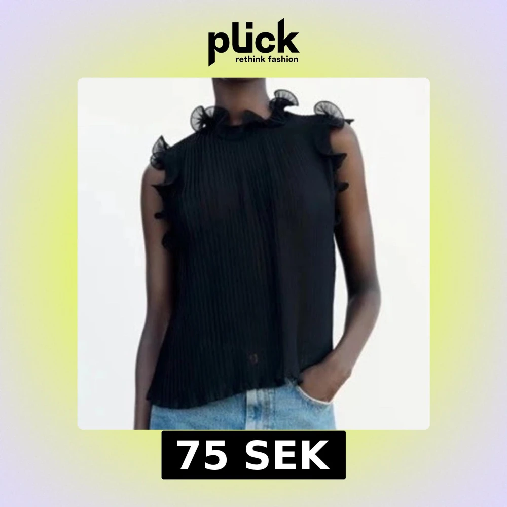 Supersnygg svart blus med plisserat tyg och volangdetaljer vid ärmhål och halsringning. Ärmlös modell som ger en luftig känsla och en cool, trendig look. Perfekt att styla med jeans eller kjol för en chic outfit.