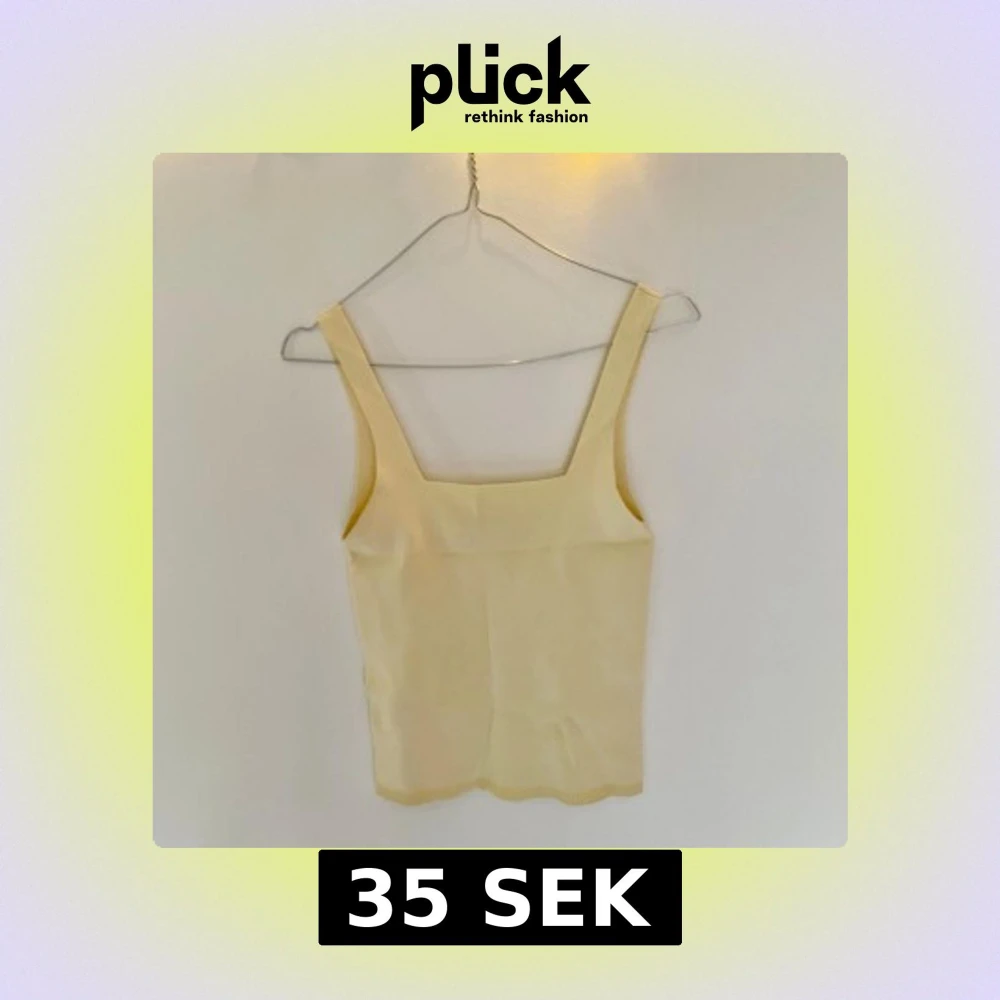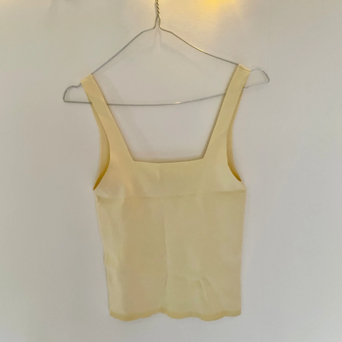 Ljusgult linne med breda axelband och fyrkantig ringning. Toppen är ärmlös och har en enkel, rak passform.