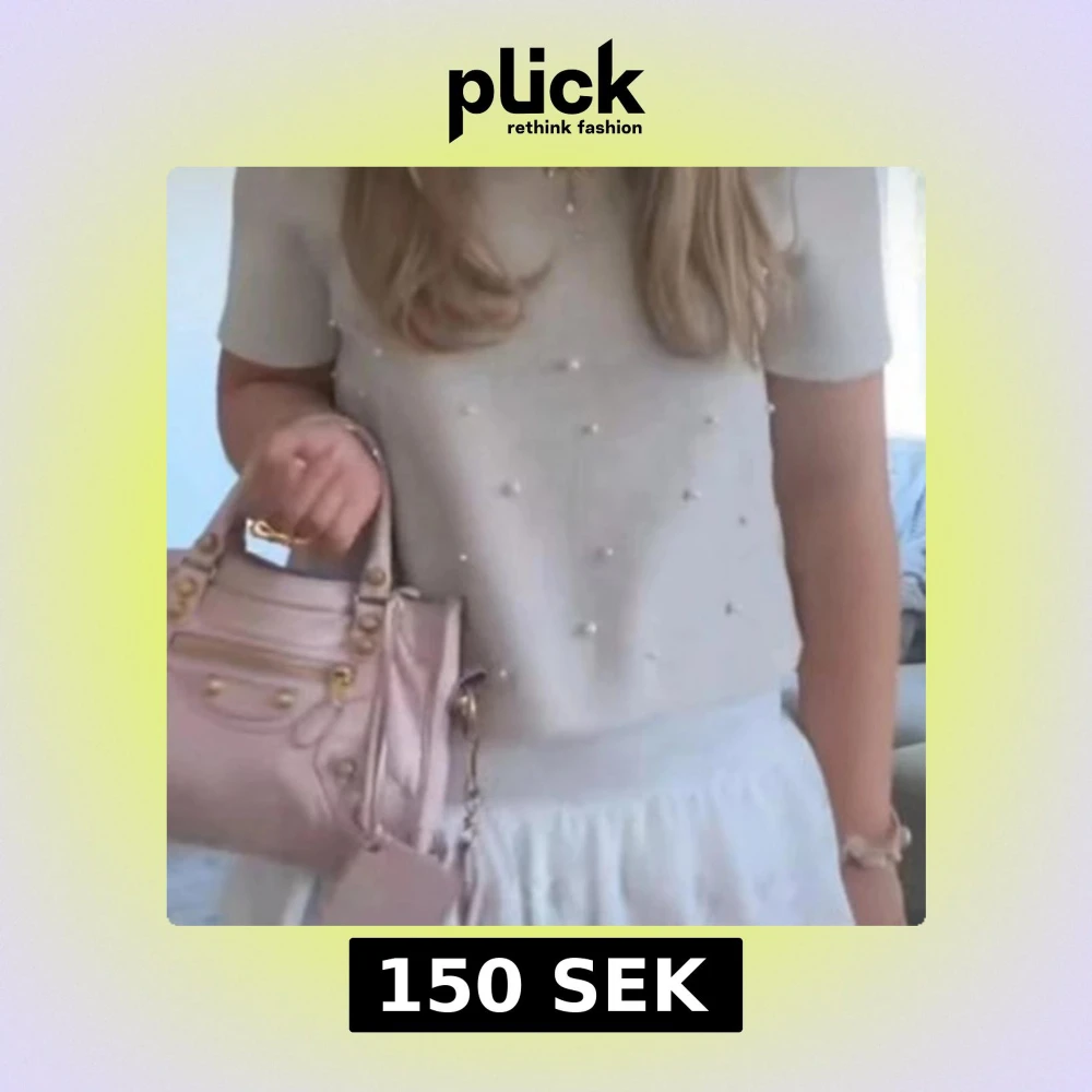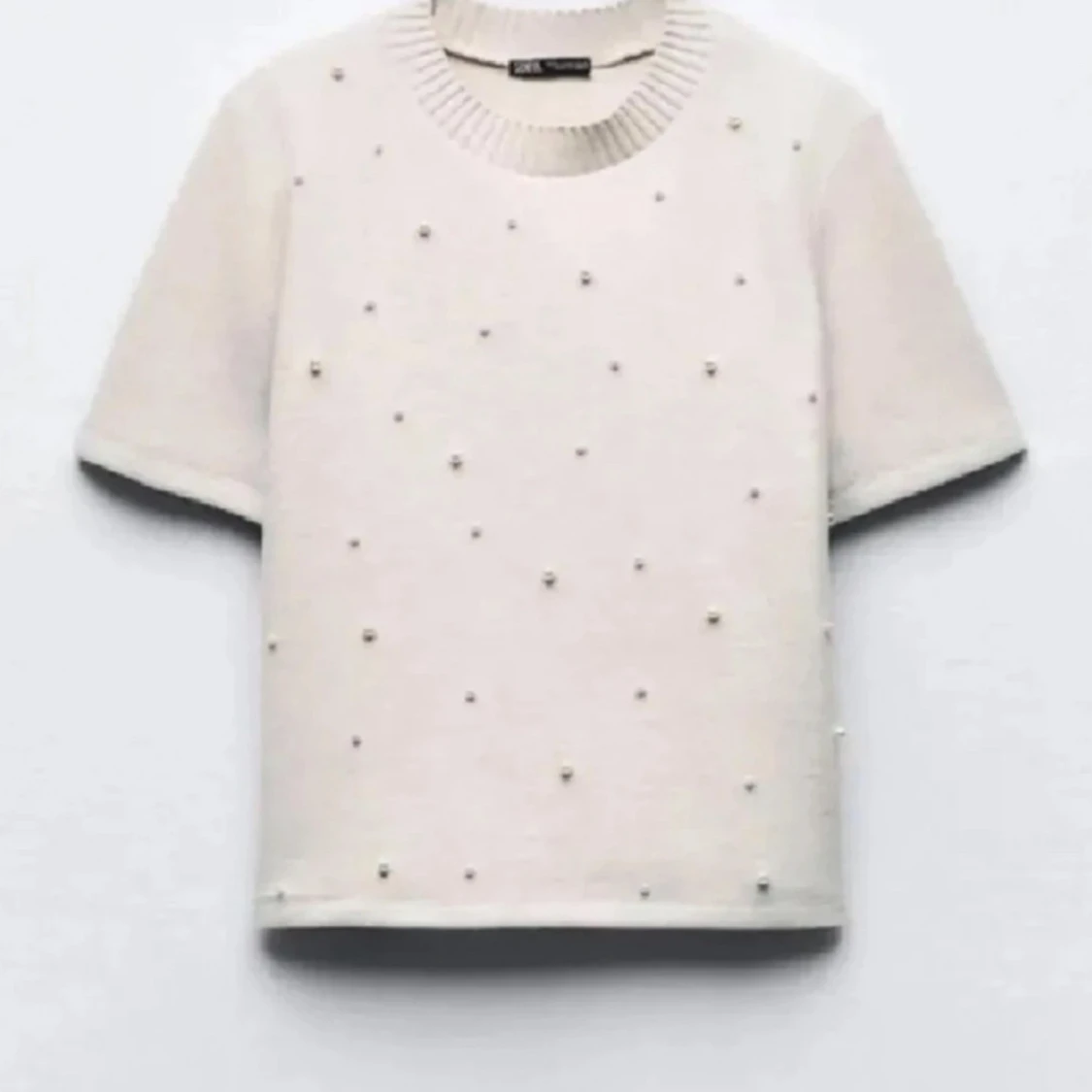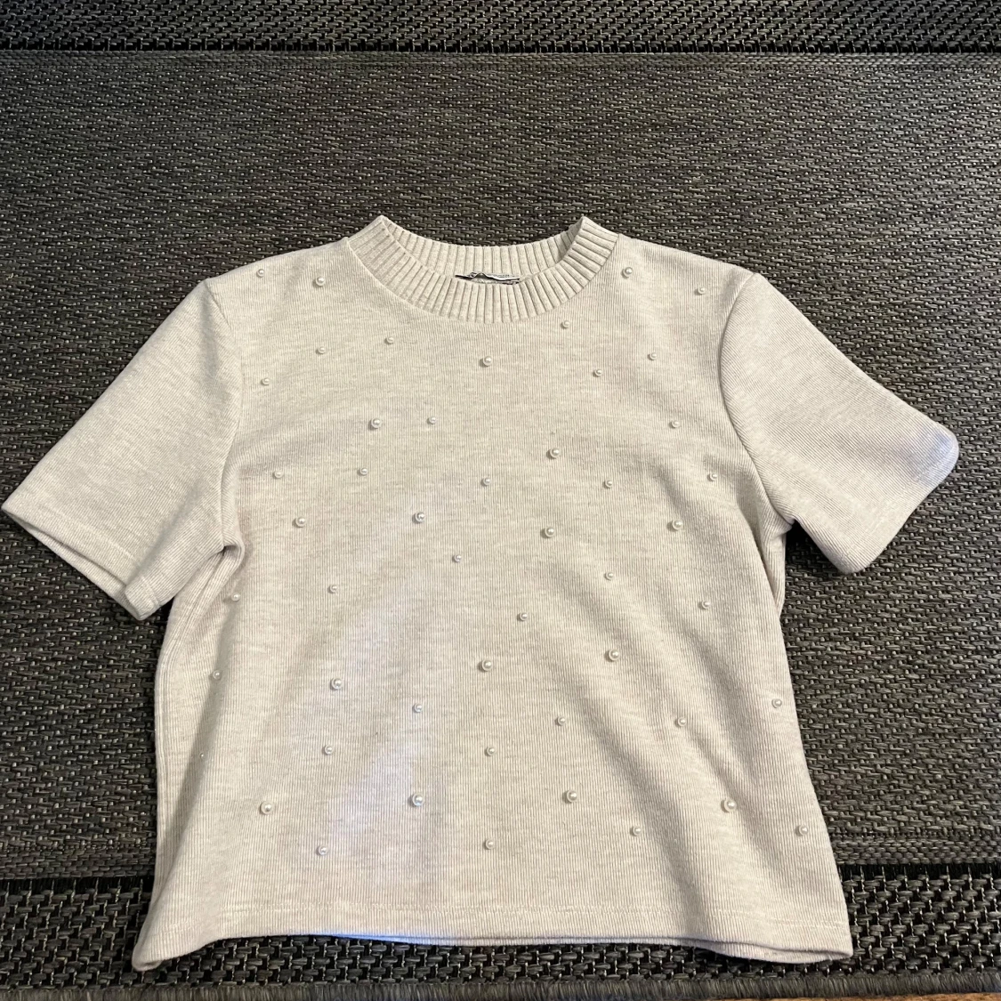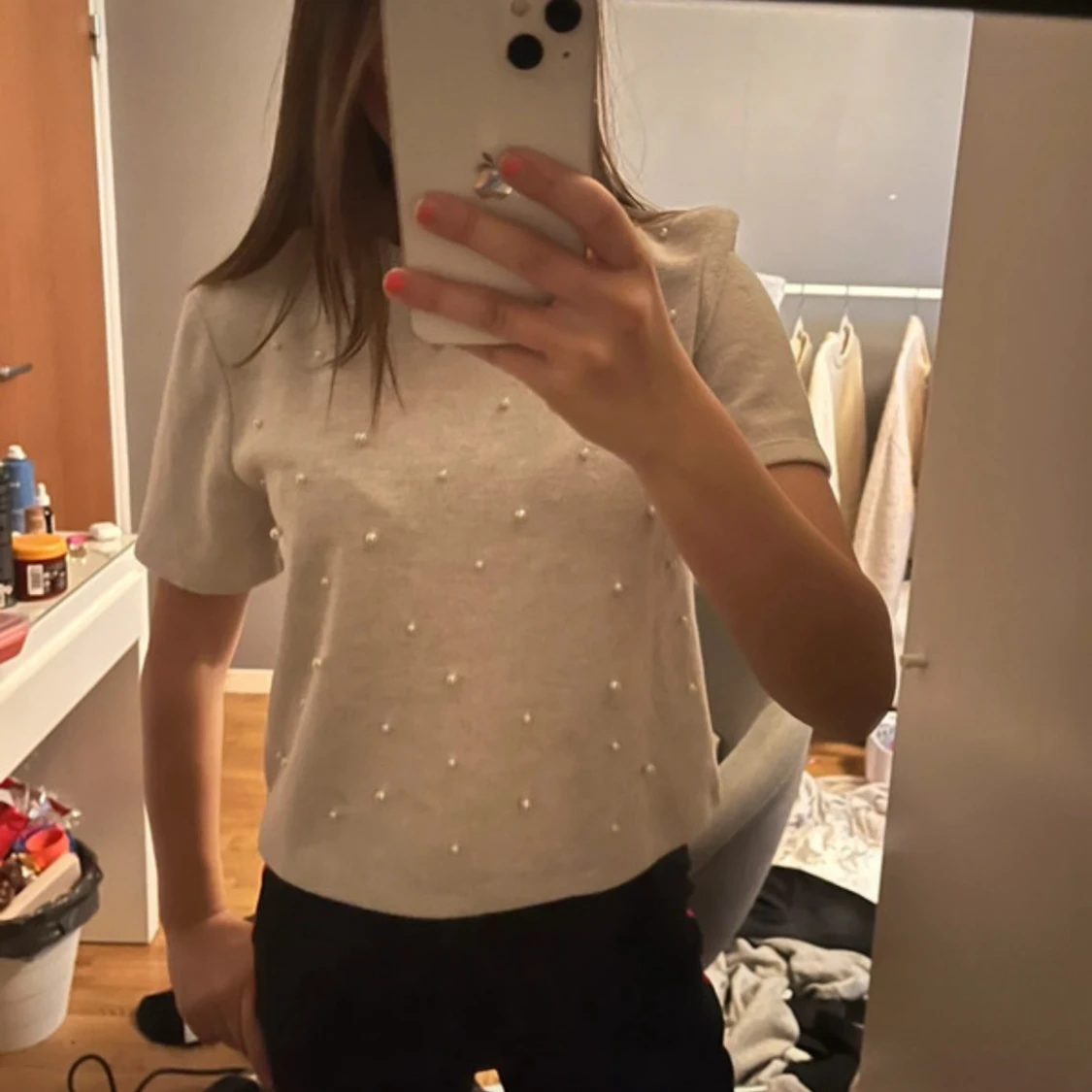 Superfin beige topp med kort ärm och ribbad rund halsringning. Toppen är dekorerad med små pärlor framtill som ger en söt och trendig look. Perfekt att styla med både jeans och kjol! Storlek m men skulle säga att den är liten i storleken! Den skulle även passa från xs-S! Använd två gånger ingen tecken på användning