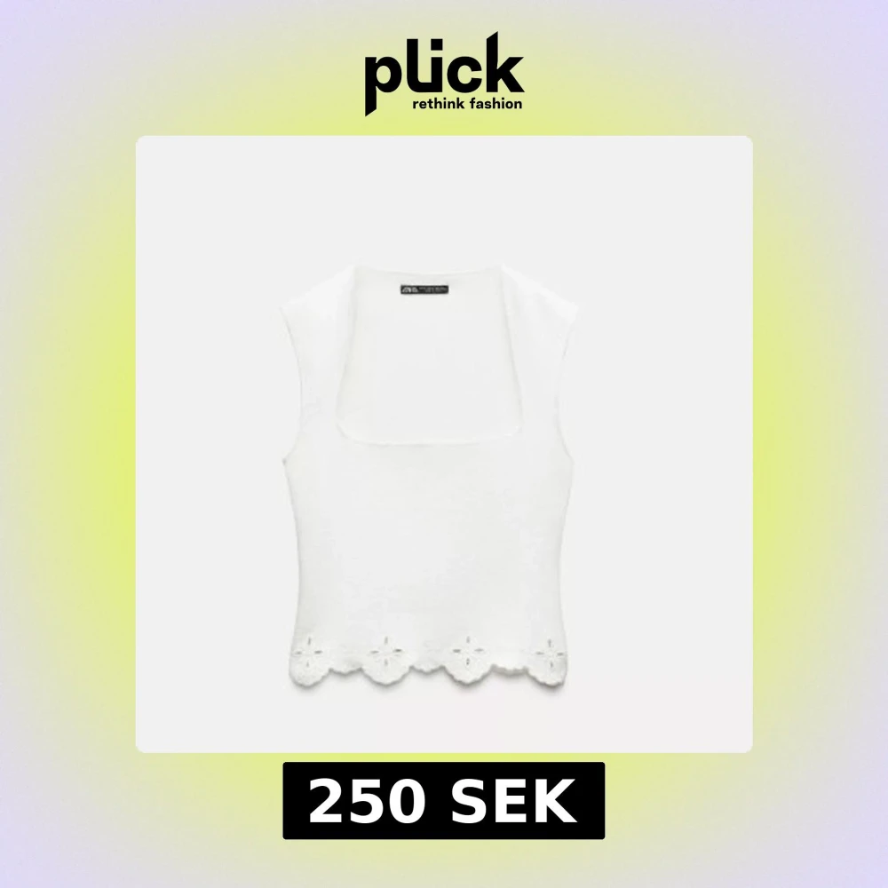 Säljer en stilren vit ärmlös topp från Zara med en unik fyrkantig halsringning. Toppen har en vacker blommig kantdetalj längst ner som ger en söt touch. Perfekt för varma dagar! Aldrig använd då den är lite för liten för mig!