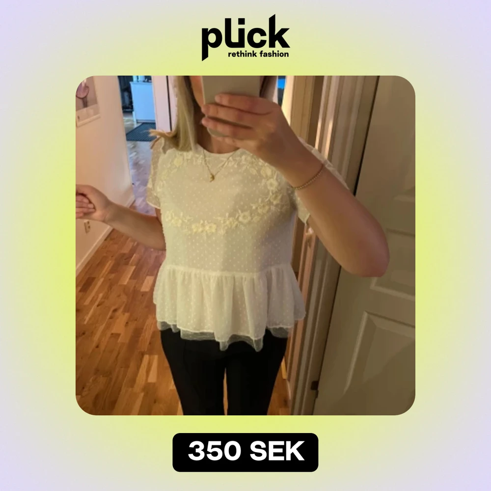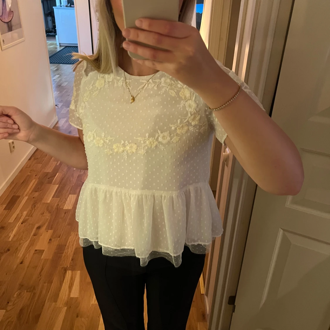 Säljer en superfin vit blus med korta ärmar och spetsdetaljer från Zara. Den har ett sött blommönster och prickar över hela tyget. 🩷
