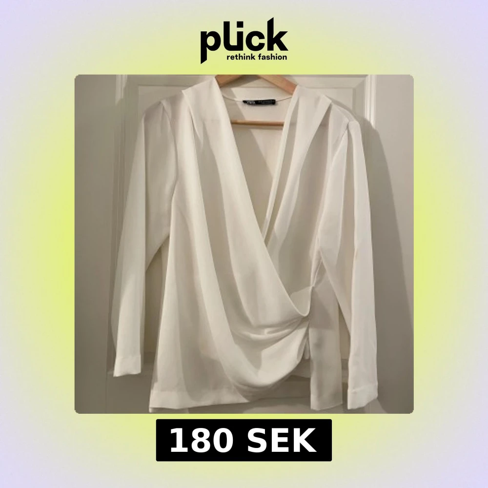 Säljer en stilren vit omlottblus från Zara i storlek M. Blusen har lång ärm, djup v-ringning och snyggt draperad front. Perfekt att styla med jeans eller kjol för en clean look.