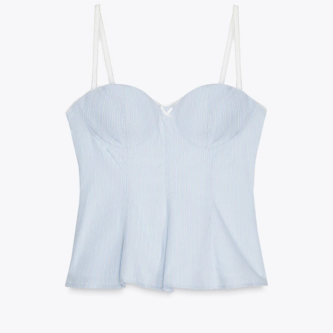 Supersöt ljusblå korsettopp med tunna axelband och diskreta vita ränder. Toppen har formade kupor och en liten rosett framtill, samt en lätt utsvängd nederdel som ger en feminin siluett. Perfekt för dig som vill ha en chic och trendig look.