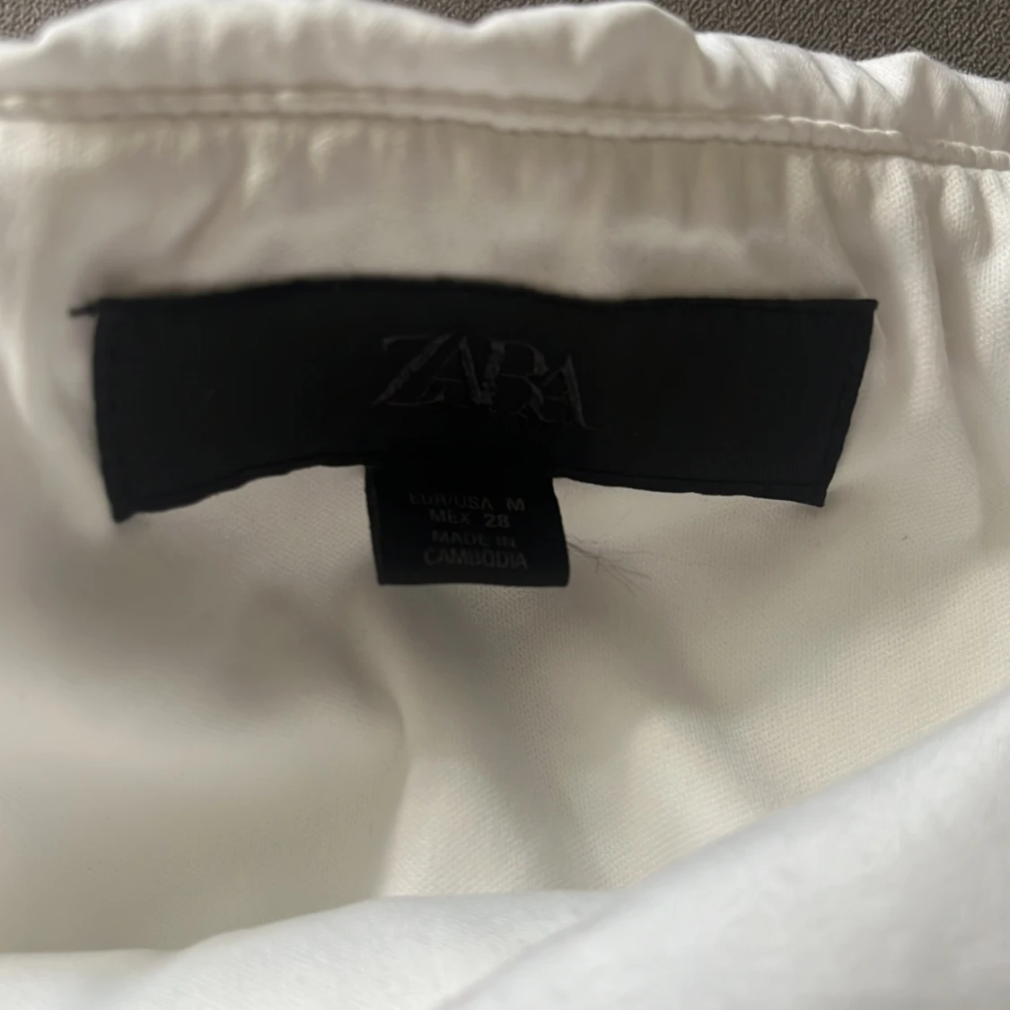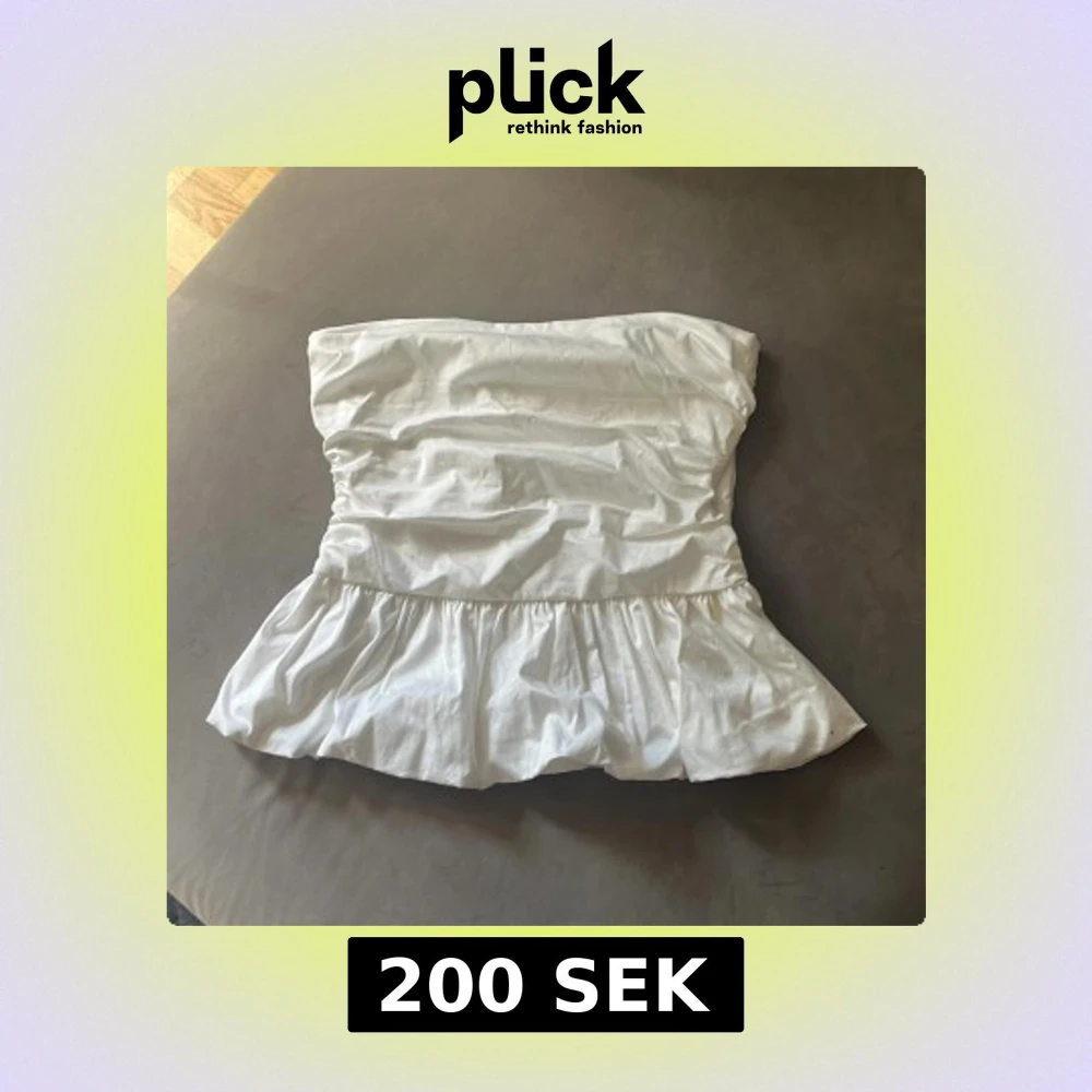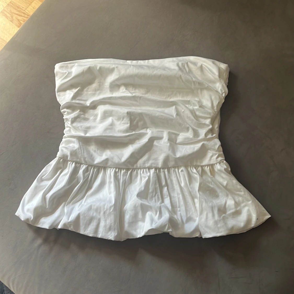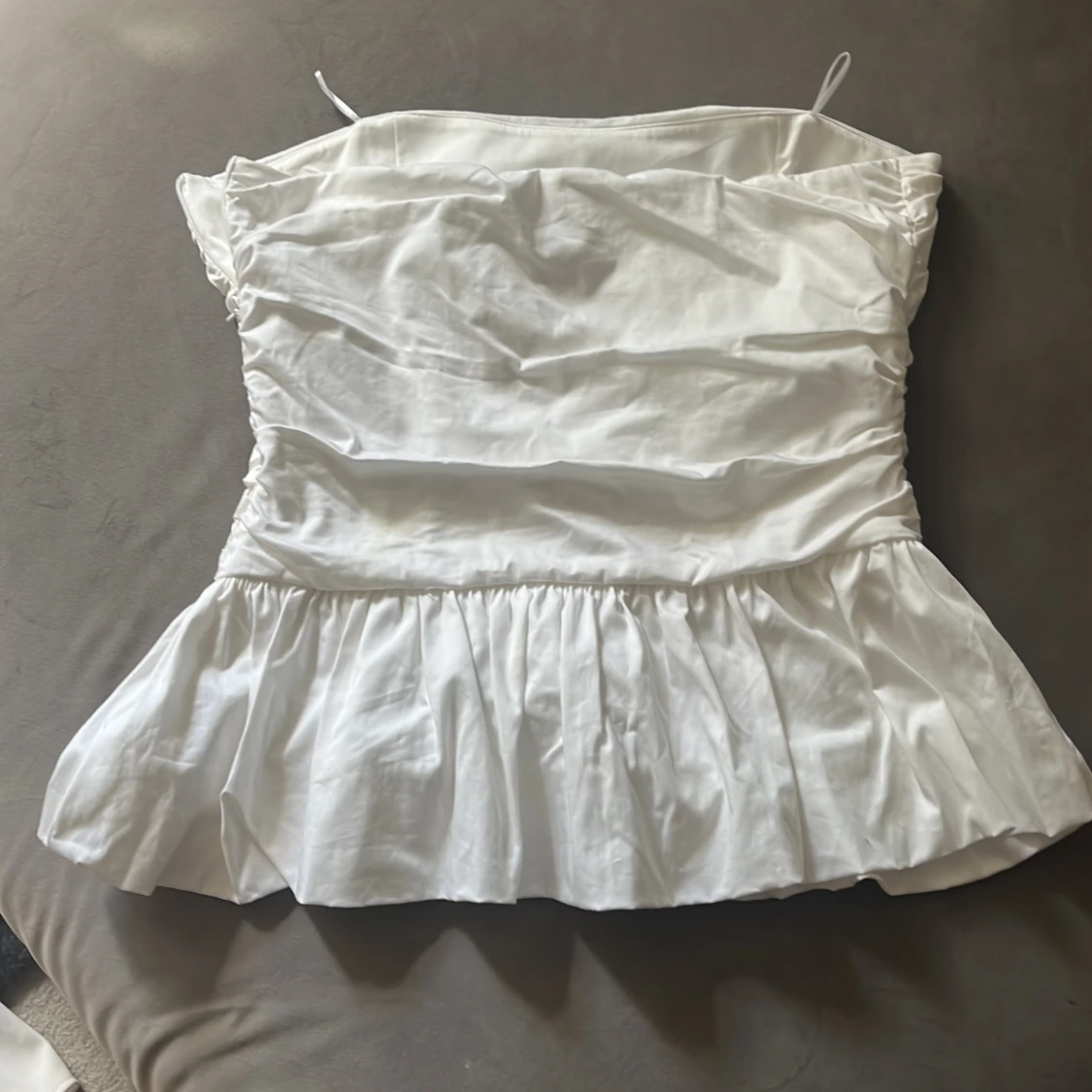 Säljer en vit tubtopp från Zara i storlek M. Toppen har en snygg volang nedtill och är axelbandslös med en lätt rynkad effekt över bröstet. Perfekt för dig som gillar en clean och fräsch look med lite extra volym. Materialet känns mjukt och luftigt.