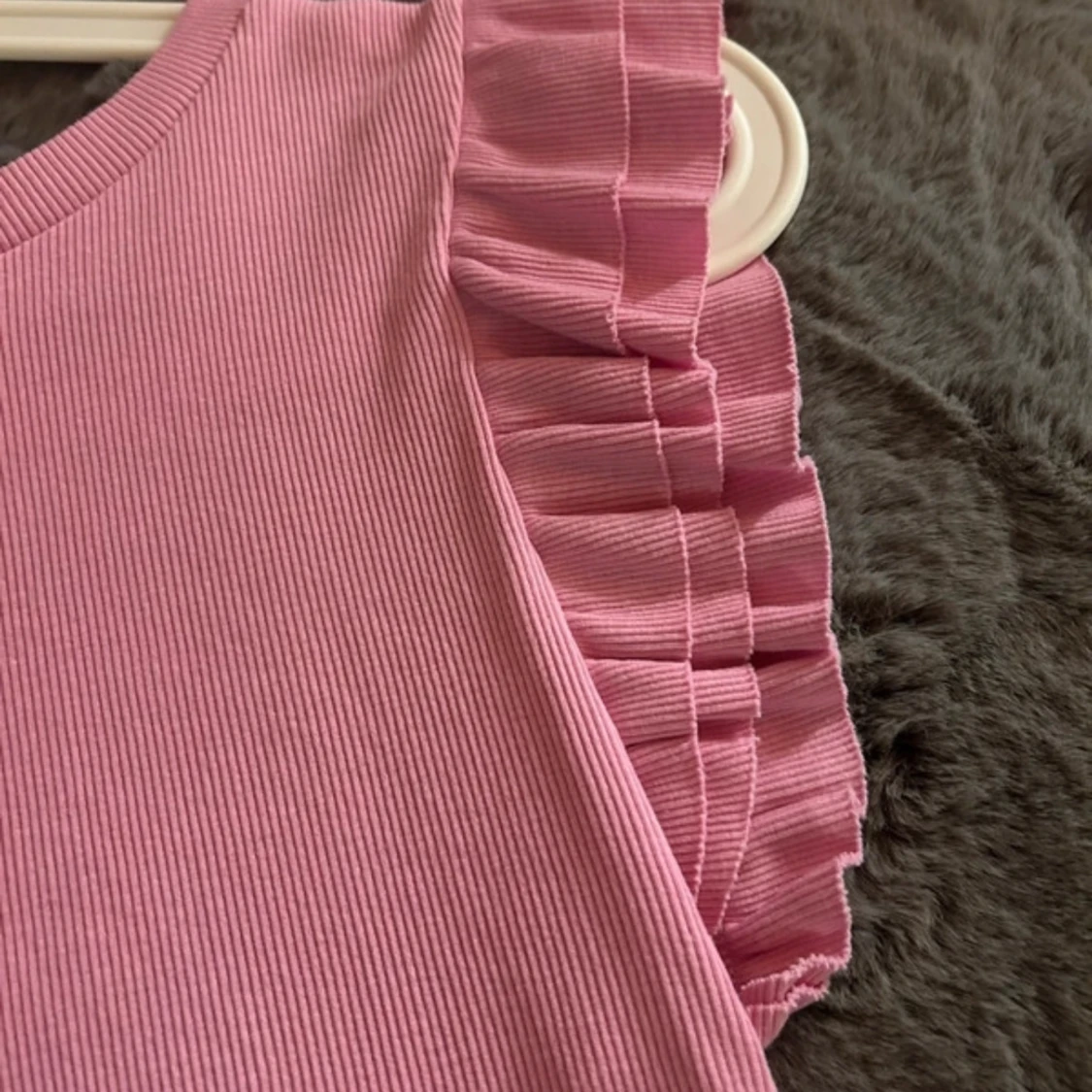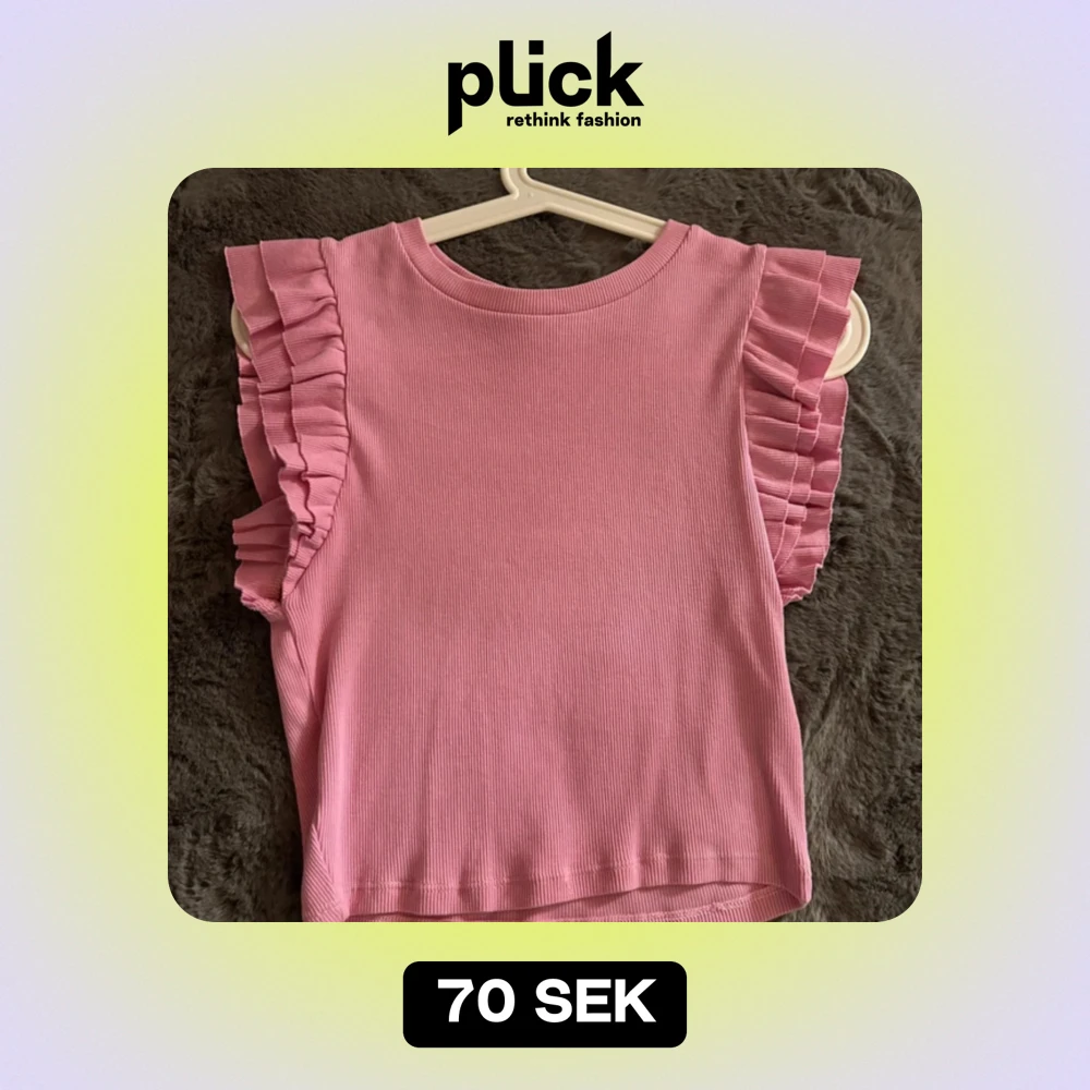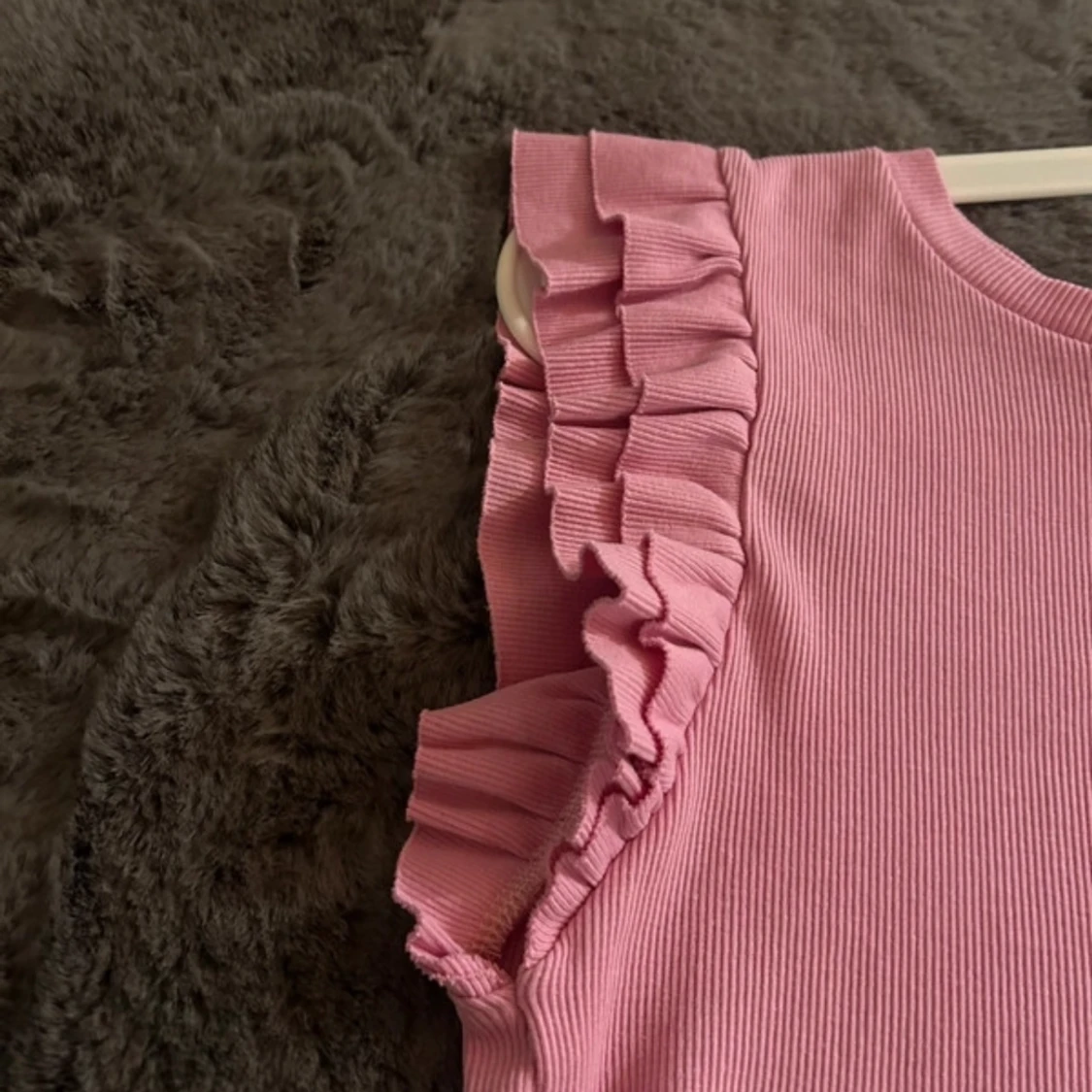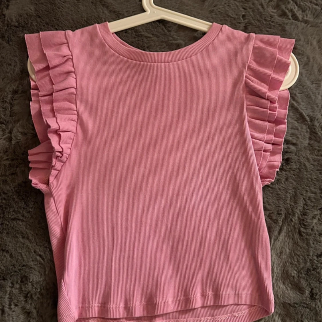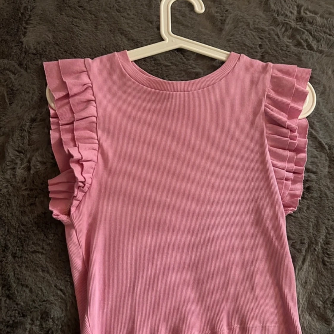 Säljer en supersöt rosa ärmlös topp med volanger på axlarna. Toppen är ribbad och har en croppad passform, perfekt för sommardagar eller en festlig look. Den är i mycket bra skick och redo för nya äventyr!