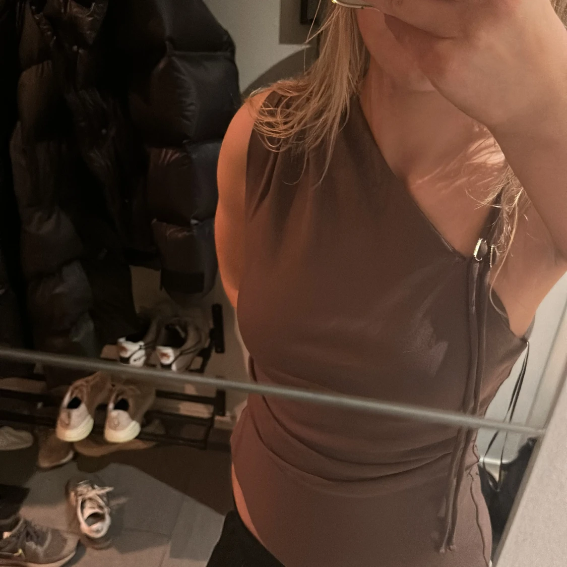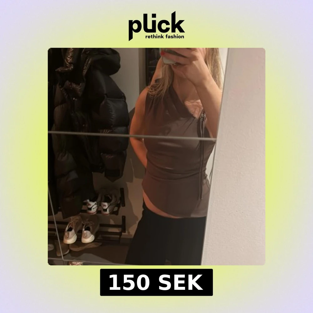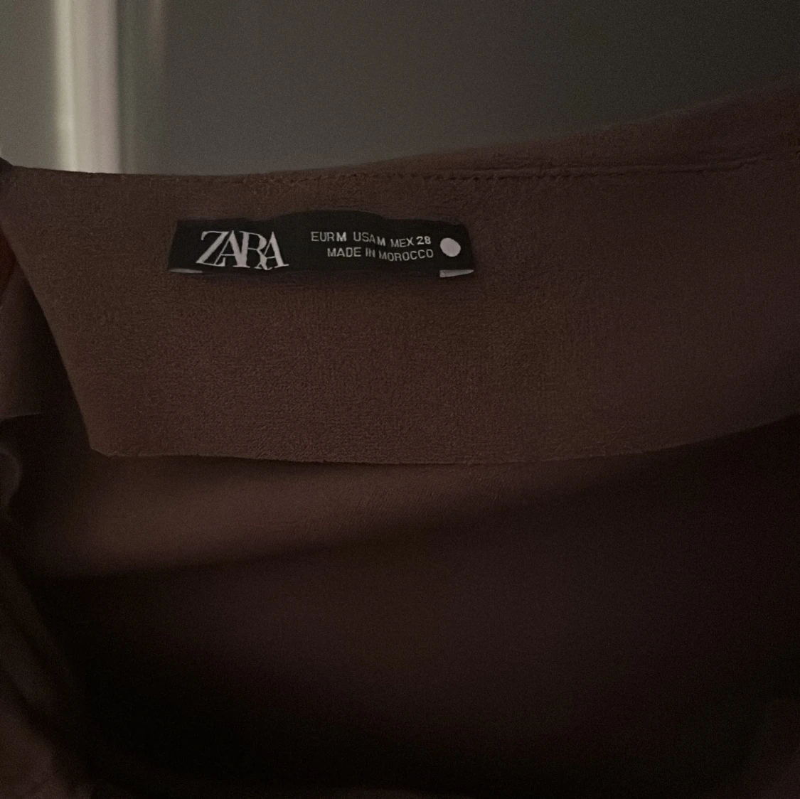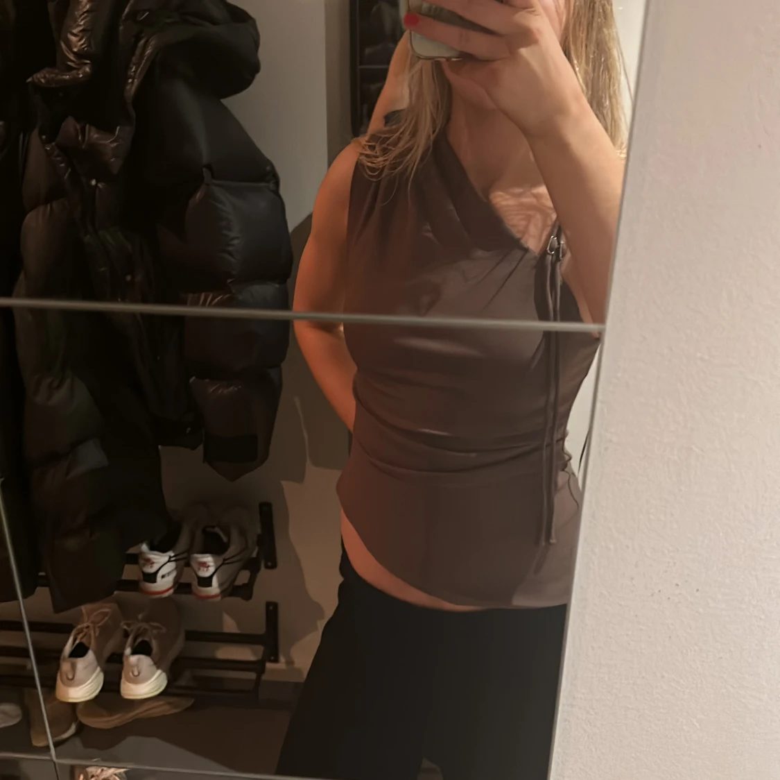 Säljer en snygg brun ärmlös topp från Zara med omlott-design och knytning i sidan. Perfekt för en stilren look. Passar bra till både jeans och kjol. Använd 1 gång.