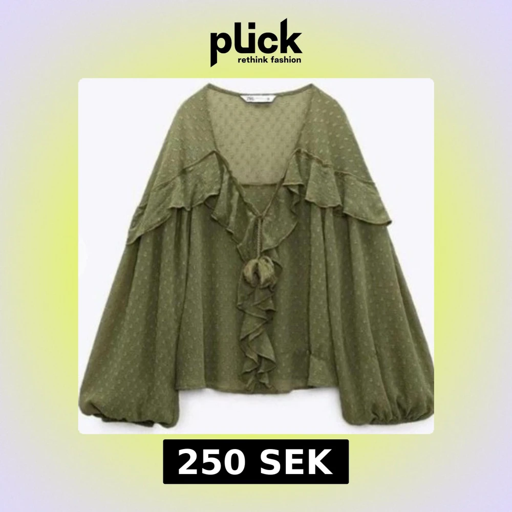 Säljer en olivgrön blus från Zara med volanger och knyt framtill. Blusen har långärmade, luftiga ärmar och ett diskret prickigt mönster. Materialet är lätt och flowy, perfekt för dig som gillar boho-vibe och detaljer som ger extra stil.