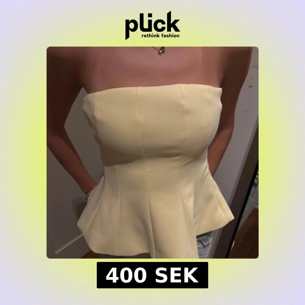 Säljer en ljusgul topp från Zara i storlek S. Toppen är axelbandslös med bandeauform och har en snygg utsvängd siluett nedtill. Materialet känns som polyester och toppen har markerade sömmar framtill för en strukturerad look. Aldrig använd