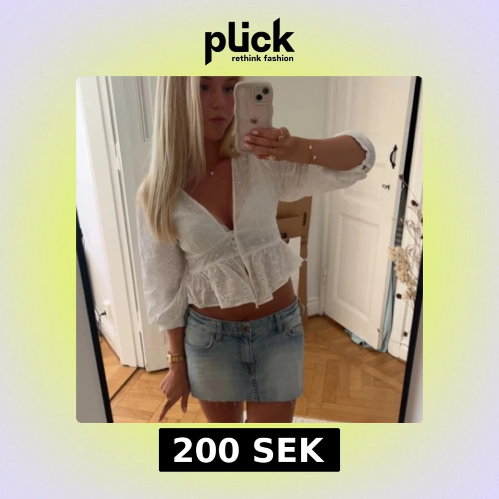 Supersöt vit blus från Zara med broderade blommor och v-ringning. Modellen är croppad med volang nertill och har trekvartsärmar. Knappar framtill och luftig bomull gör den perfekt för varma dagar. Perfekt att styla med jeans eller kjol!