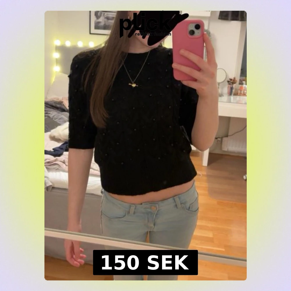 Säljer en svart croppad stickad topp med korta ärmar och små pärlor som detalj. Toppen har ett snyggt mönster i stickningen och ribbad kant nedtill. Den är i jätte bra skick och är nästan aldrig använd. Använd gärna köp nu