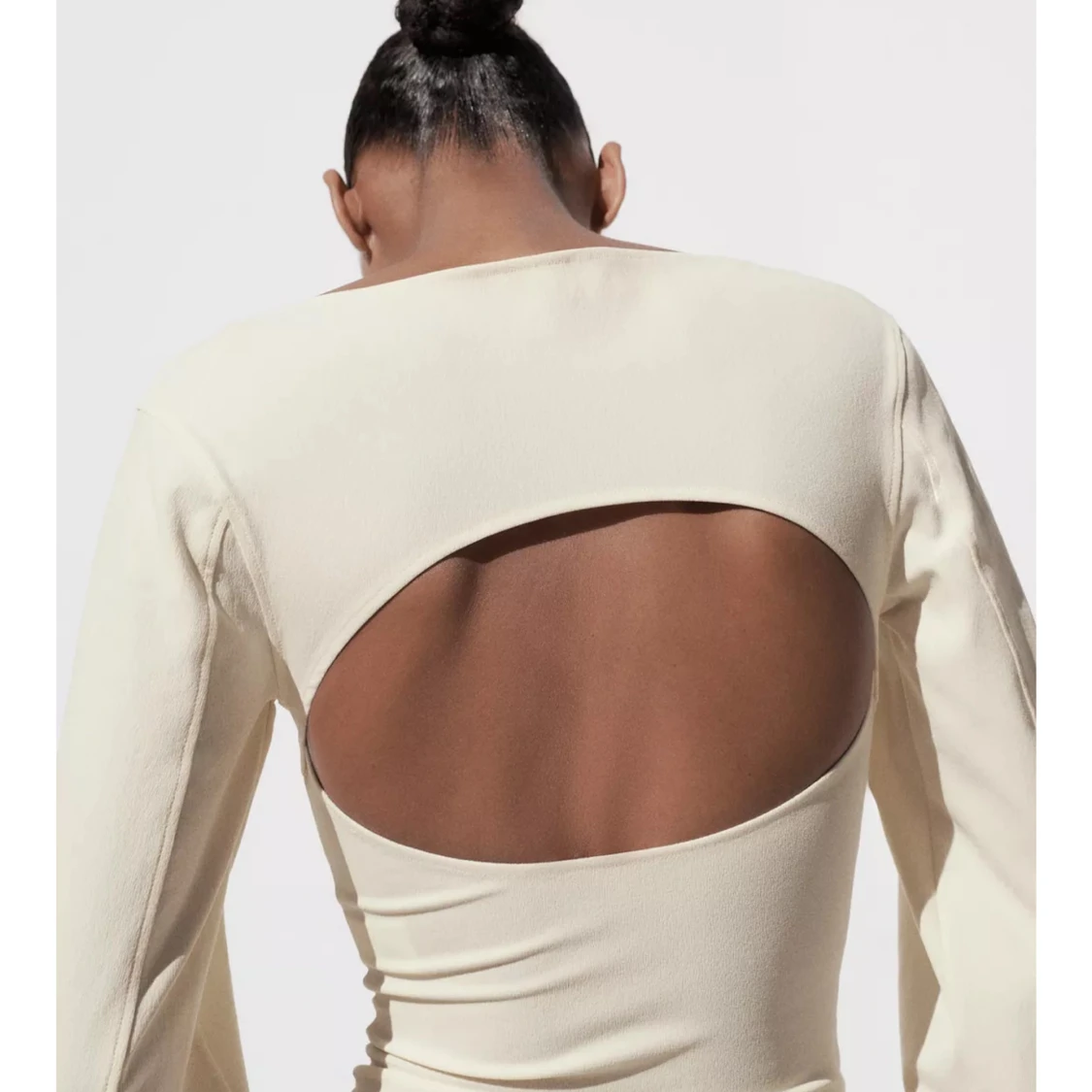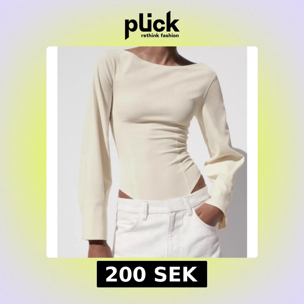 Säljer en stilren beige långärmad topp med tight passform och snygg öppen rygg. Toppen har en asymmetrisk halsringning och är tillverkad i ett mjukt, stretchigt material som sitter riktigt snyggt på kroppen. Perfekt för dig som gillar minimalistisk och trendig stil.