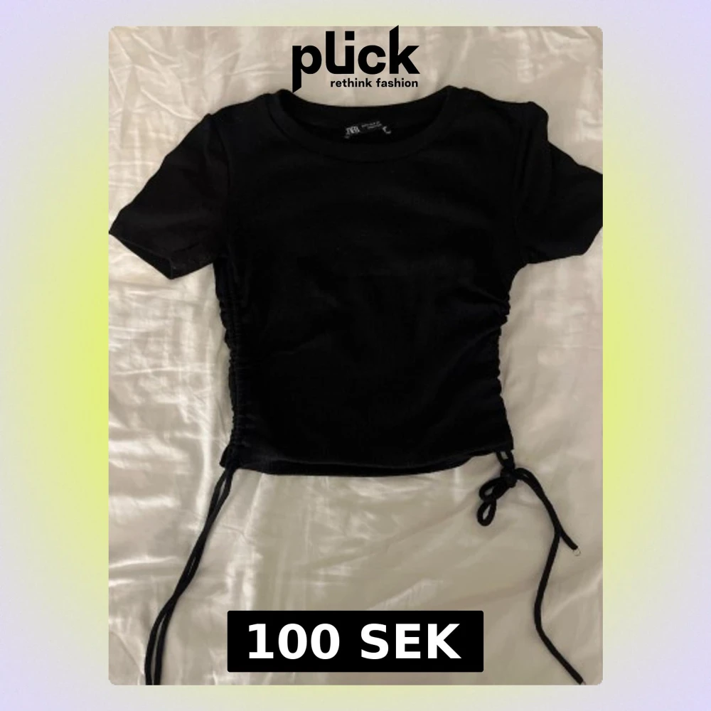 Säljer en svart topp med snörning på sidorna från Zara. Toppen har en rund sopringad hals och är tillverkad i ett mjukt, ribbat material som sitter snyggt på kroppen.