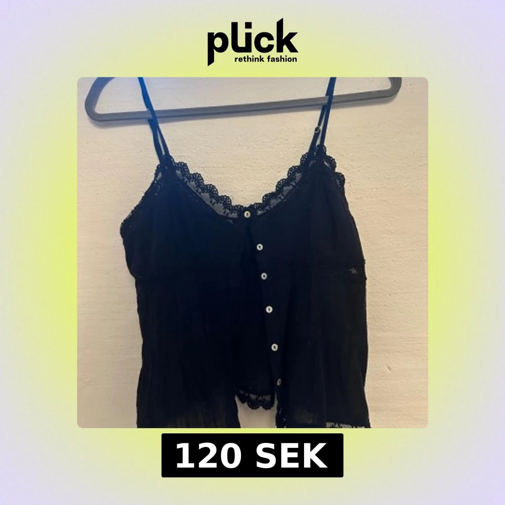 Säljer en svart linnetopp med tunna axelband och dekorativ spets längs halsringning och nederkant. Toppen har vita knappar framtill och är lätt transparent med en luftig passform. Perfekt för dig som gillar en chill och feminin stil.