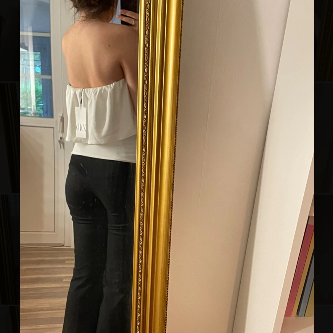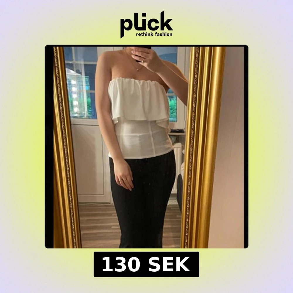 Säljer en vit bandeau tubtopp från Zara med volang upptill. Toppen är axelbandslös och har en snygg croppad passform som sitter tight mot kroppen. Helt ny med prislapp!