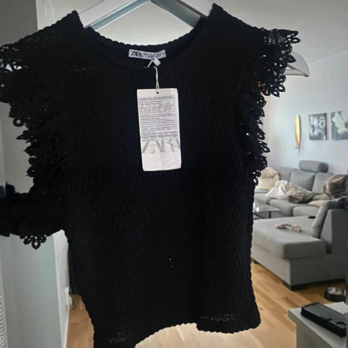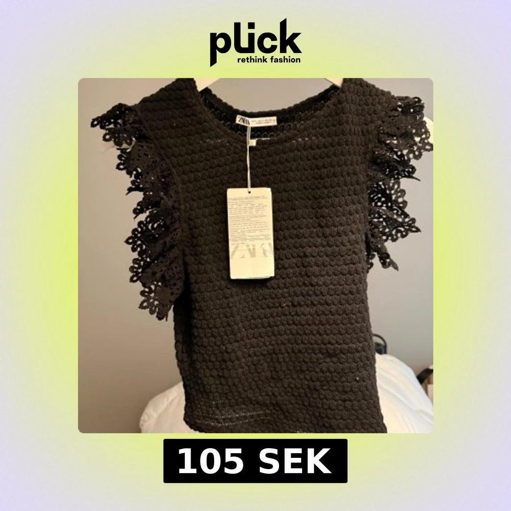 Snygg svart topp från Zara i ett stickat material med dekorativa spetsdetaljer på axlarna. Perfekt för både vardag och fest! Toppen är i nytt skick med etikett kvar 🌸