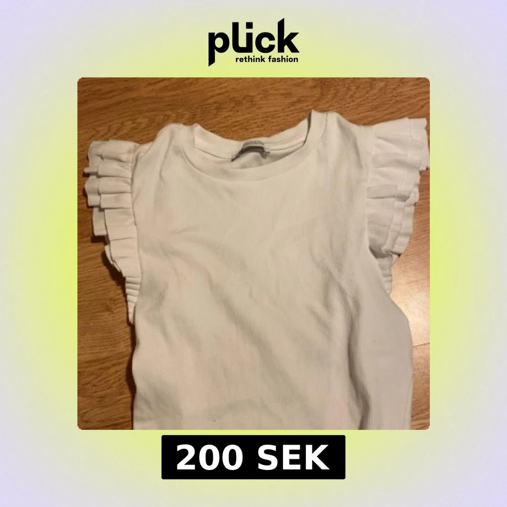 vit topp från Zara med ribbad struktur och volangärmar. Toppen är ärmlös med breda, plisserade volanger som ger en extra touch. Mjuk och stretchig känsla. Aldrig använt.