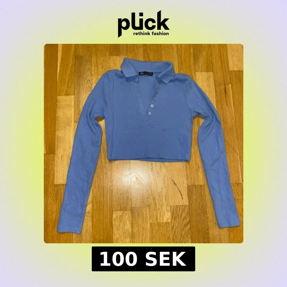 Säljer en snygg blå croppad polotopp från Zara. Toppen har långa ärmar och knappar framtill. Perfekt för en stilren look.