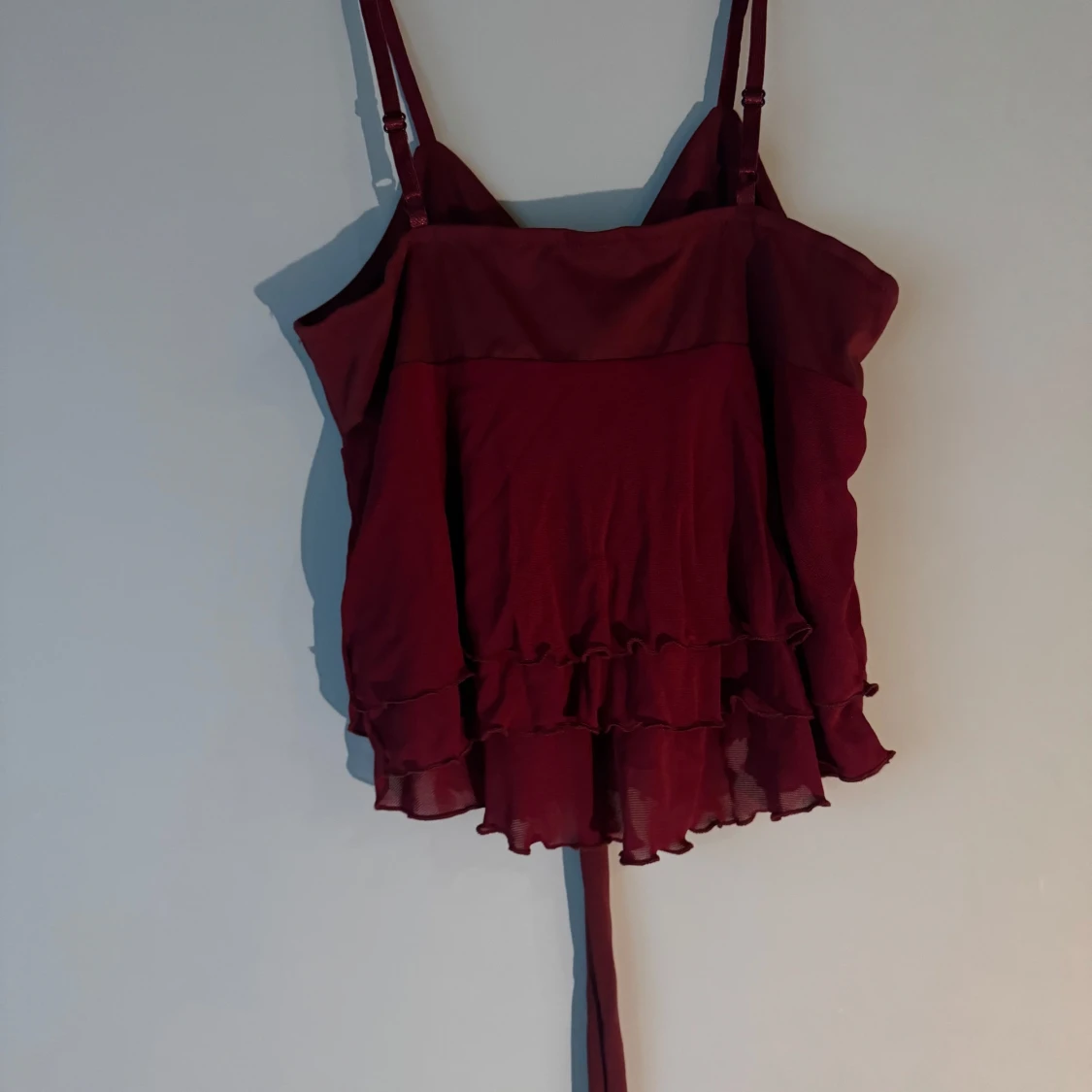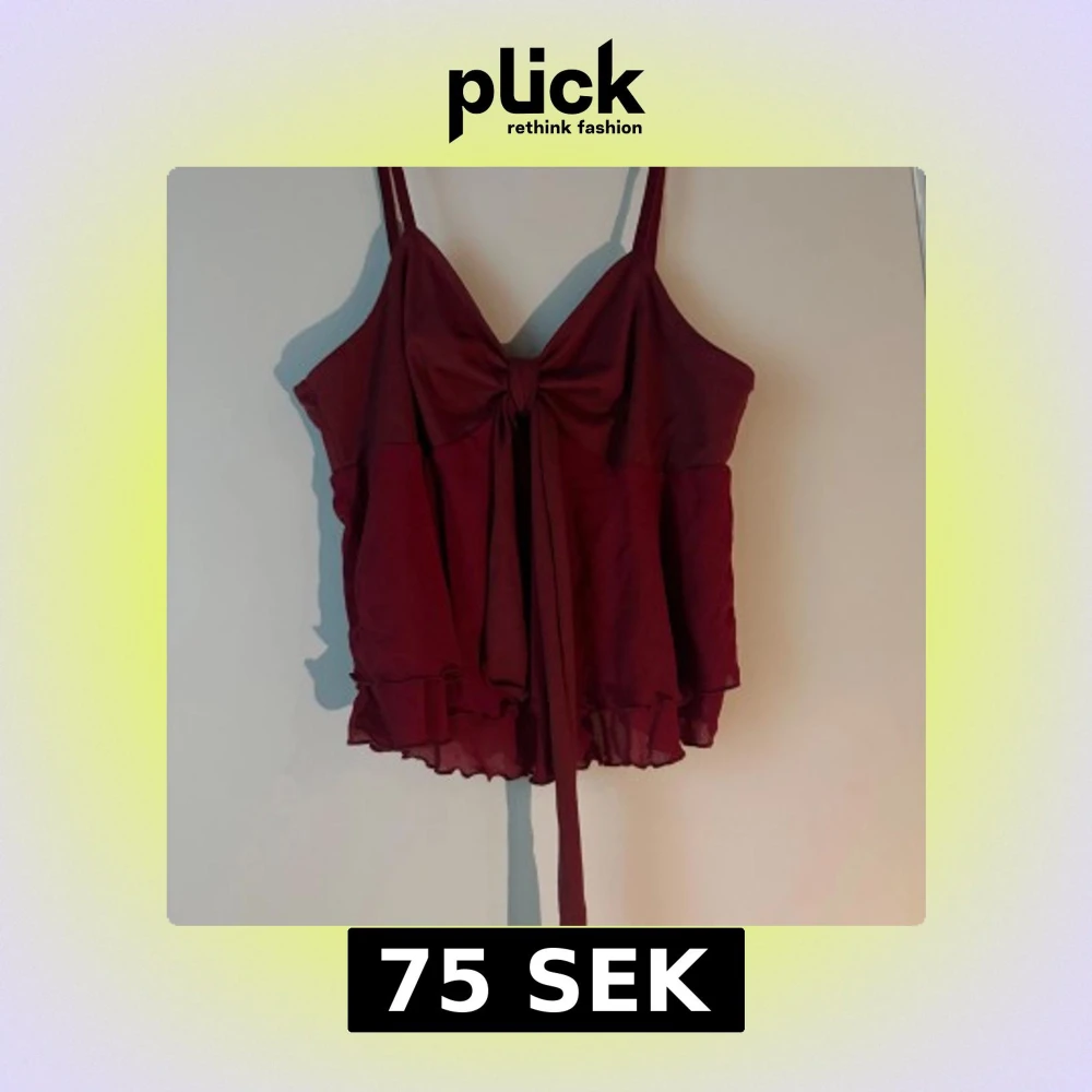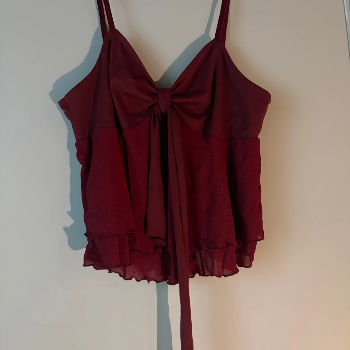 Supersöt vinröd linnetopp med smala axelband, stor rosett framtill och volangkant nertill. Toppen har en flowy passform 🌺🌸