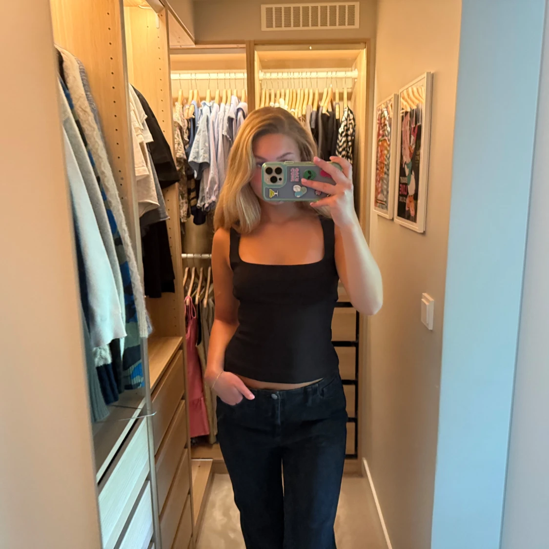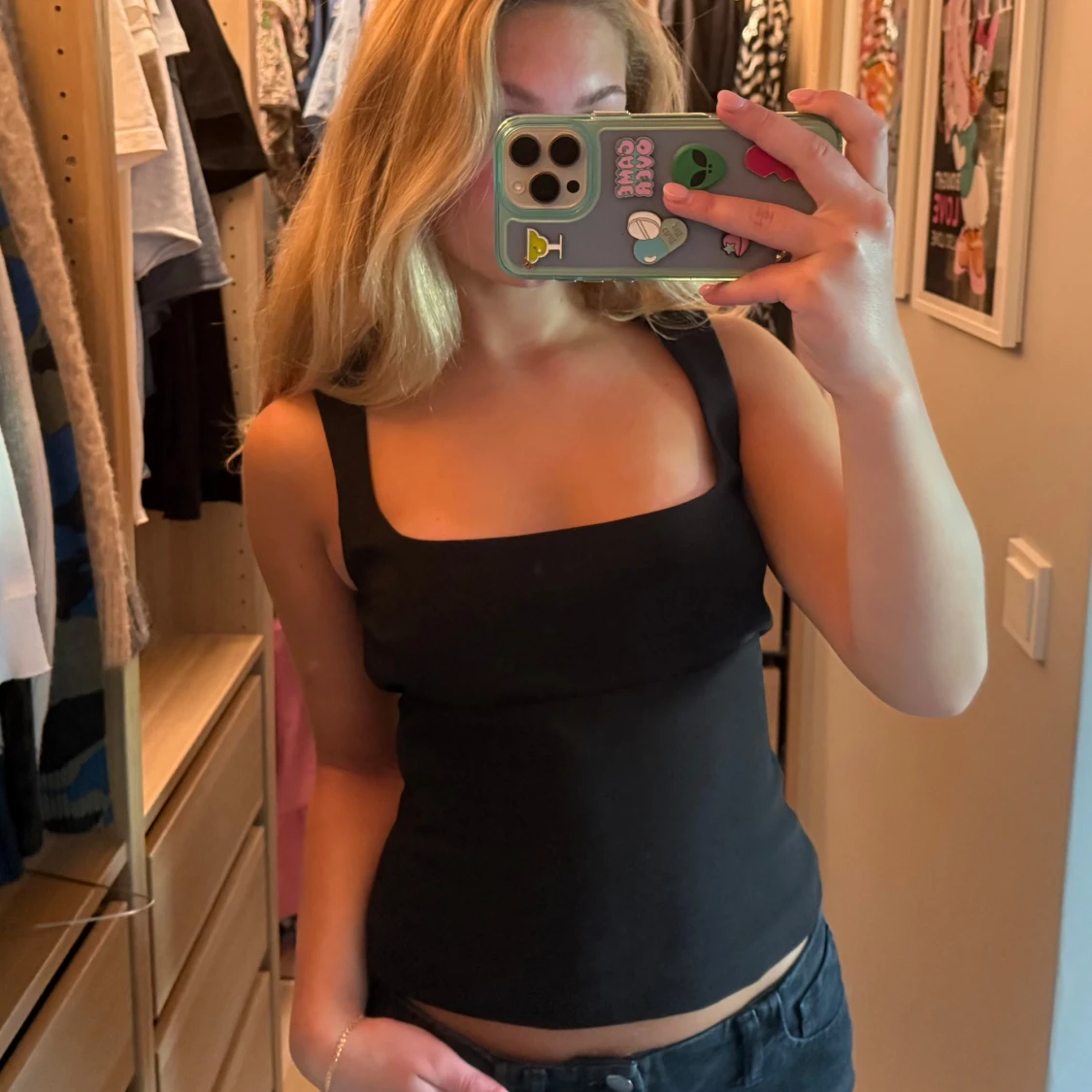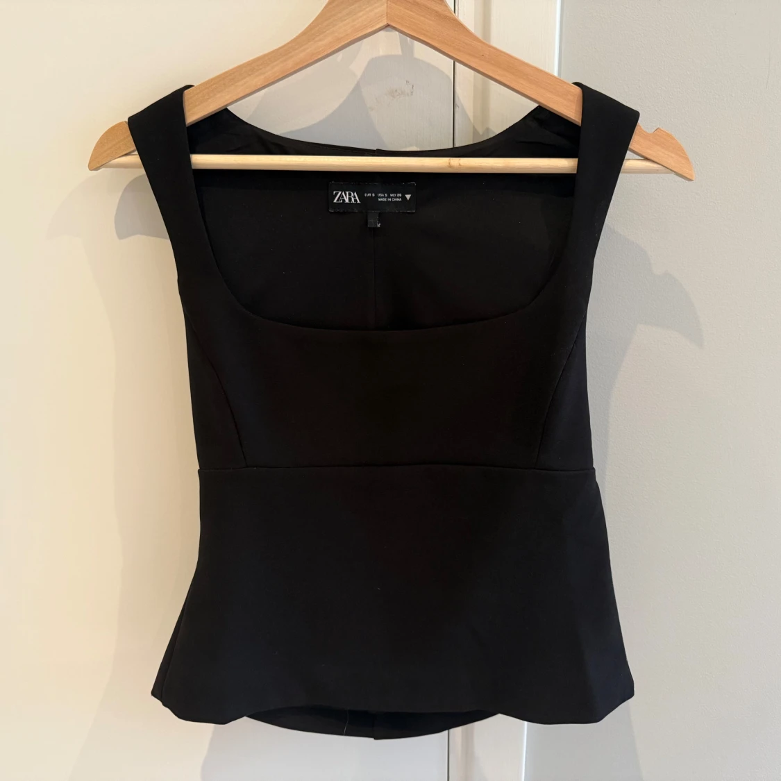 Snygg svart topp Zara med breda axelband och fyrkantig urringning. Toppen är figurnära. Stretchigt material.