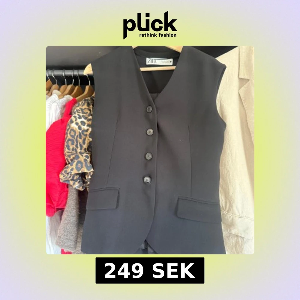 Stilren svart väst från Zara med klassisk v-ringning och fyra knappar framtill. Västen har två fickor med lock och ett justerbart bälte baktill för perfekt passform. Snygg och enkel design som passar till många looks.