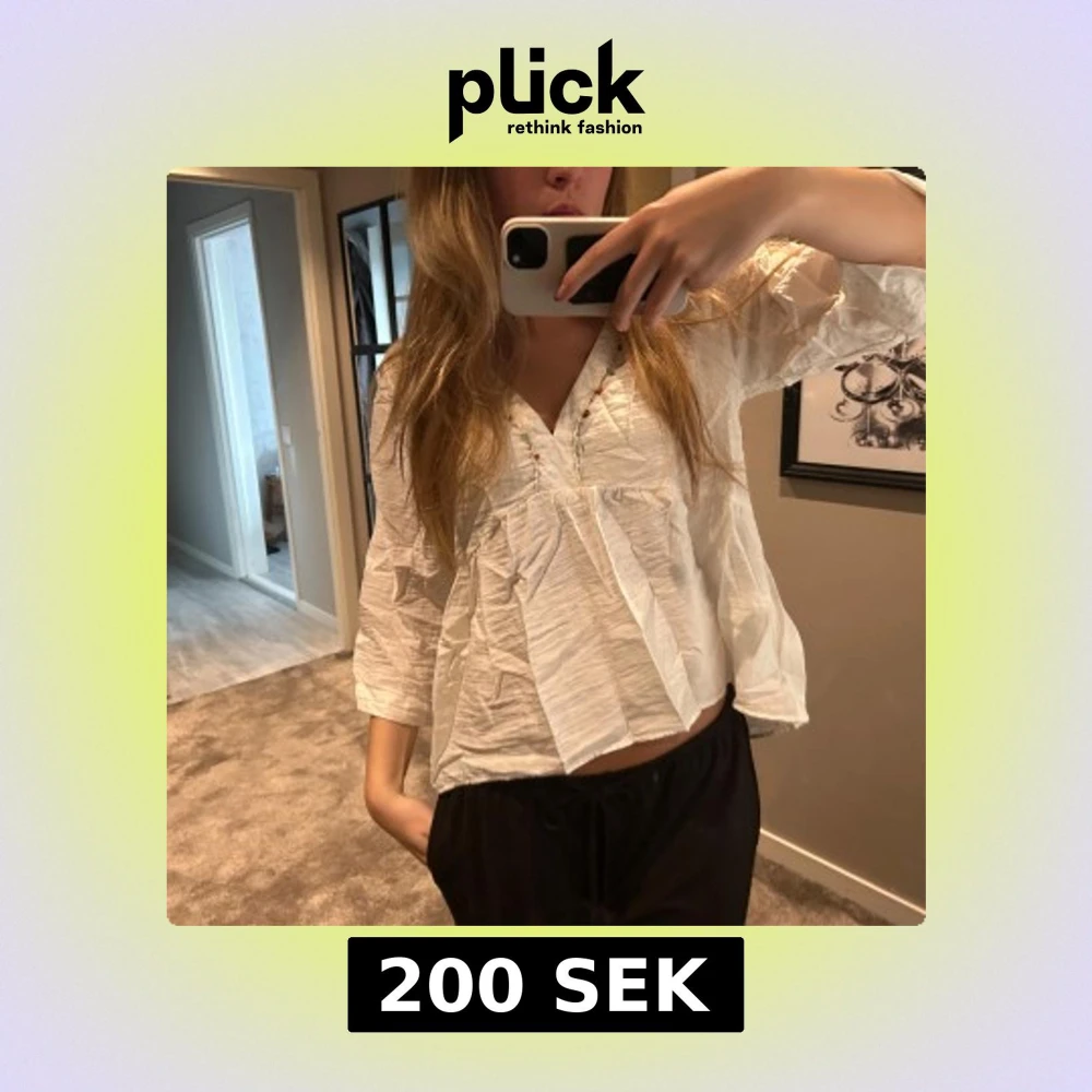 Superfin vit blus från Zara med v-ringning och små färgglada pärlor längs ringningen. Blusen har en lös passform, trekvartsärmar och är gjord i ett lätt, skrynkligt bomullstyg. Passar S/M