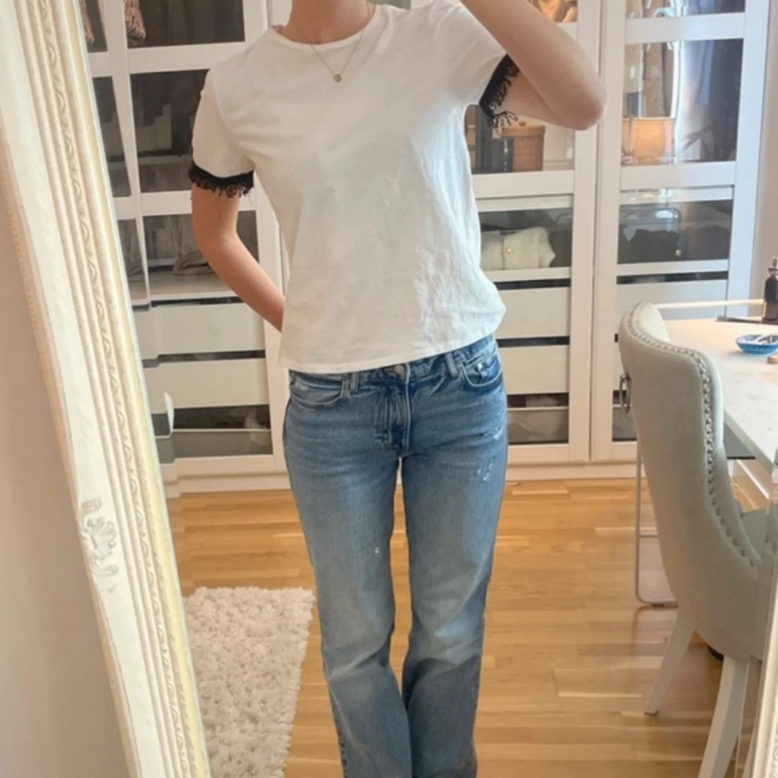 Säljer en vit t-shirt med svarta detaljer på ärmen! Har knappt kommit till användning ❤️