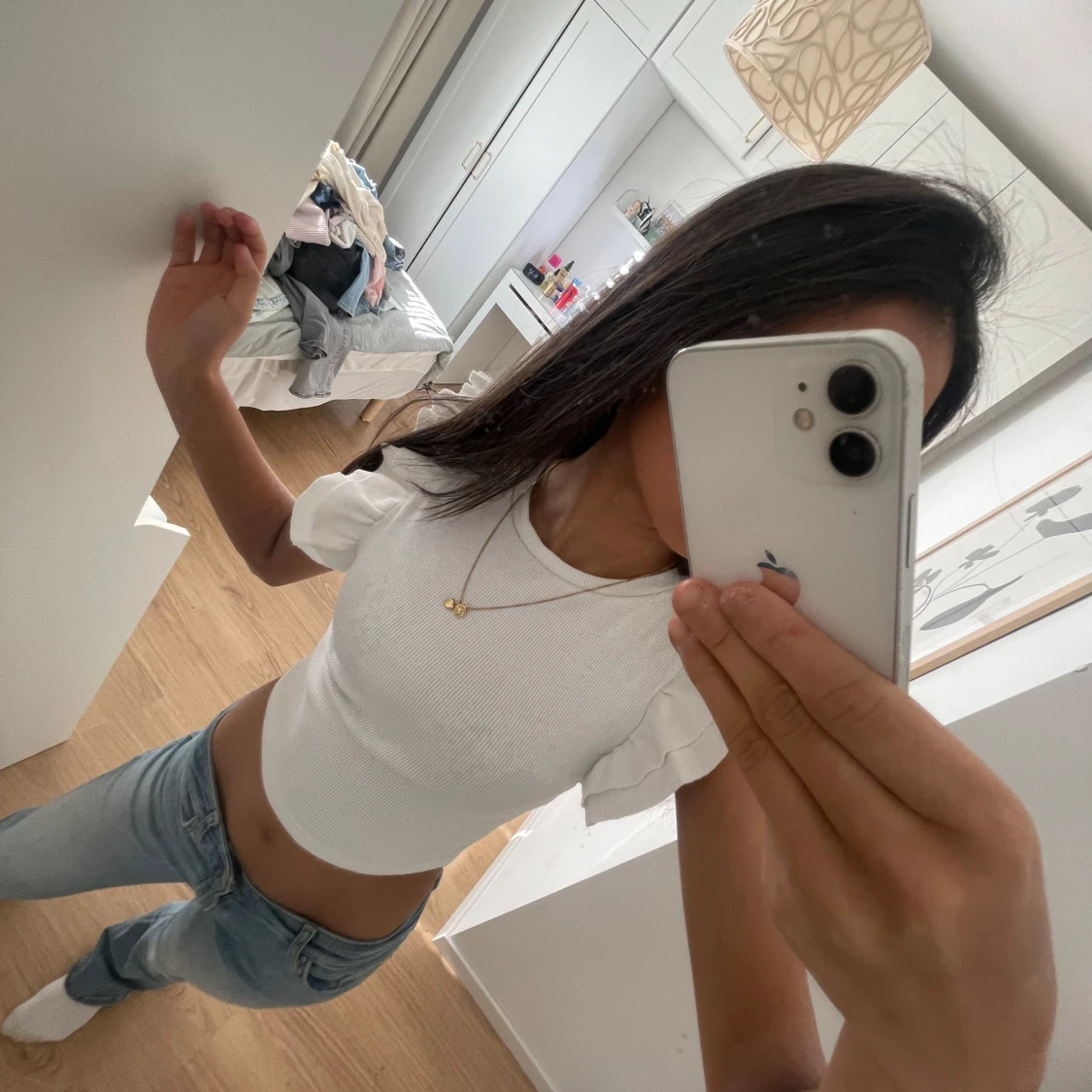 Säljer en vit croppad topp med ribbad struktur och volangdetaljer på ärmarna.🥰 Toppen har rund halsringning och är figurnära i passformen.💖 Perfekt till jeans eller kjol för en trendig look.😇
