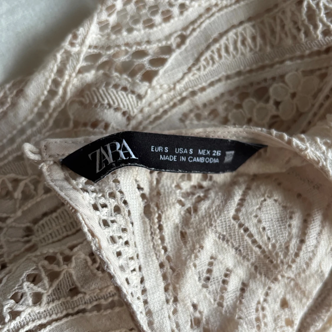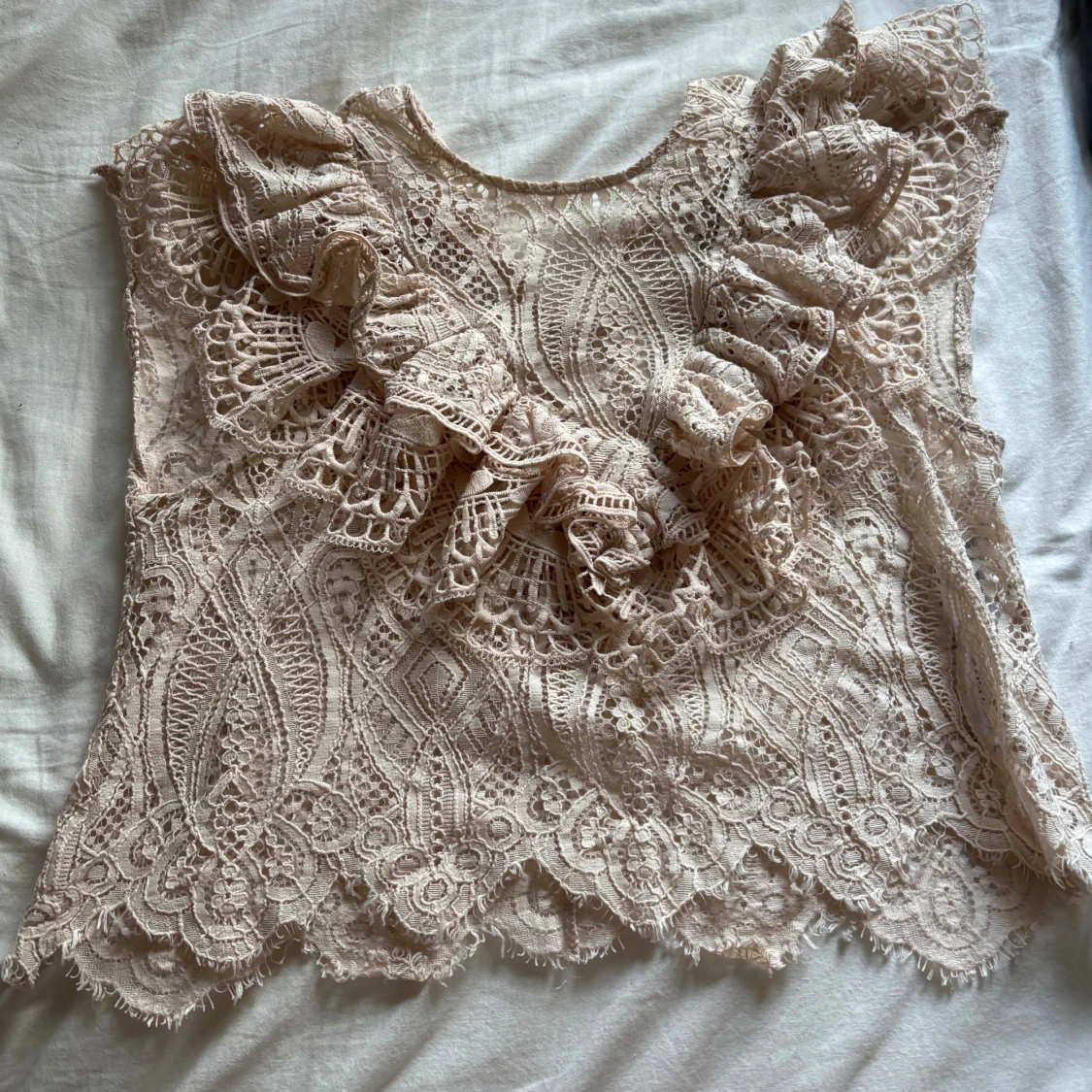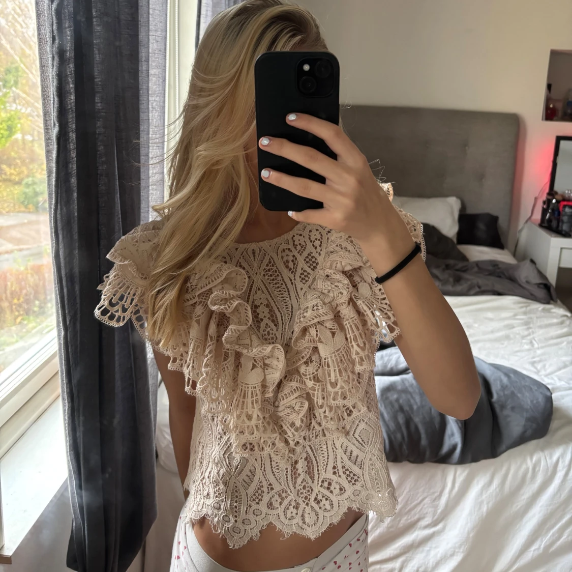 Supersöt beige spetsblus från Zara med volangdetaljer framtill och vackert mönstrad spets. Blusen är ärmlös och har en liten knapp i nacken. Perfekt för dig som gillar romantisk och feminin stil.