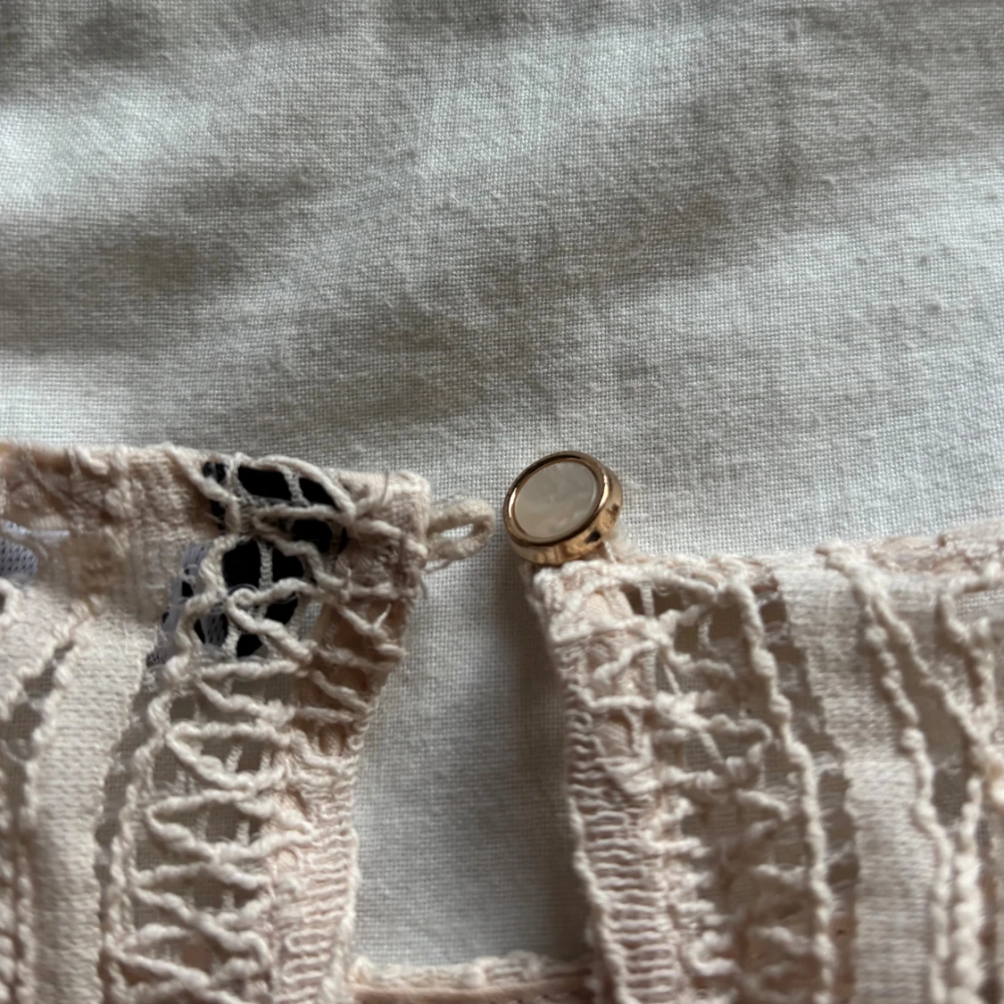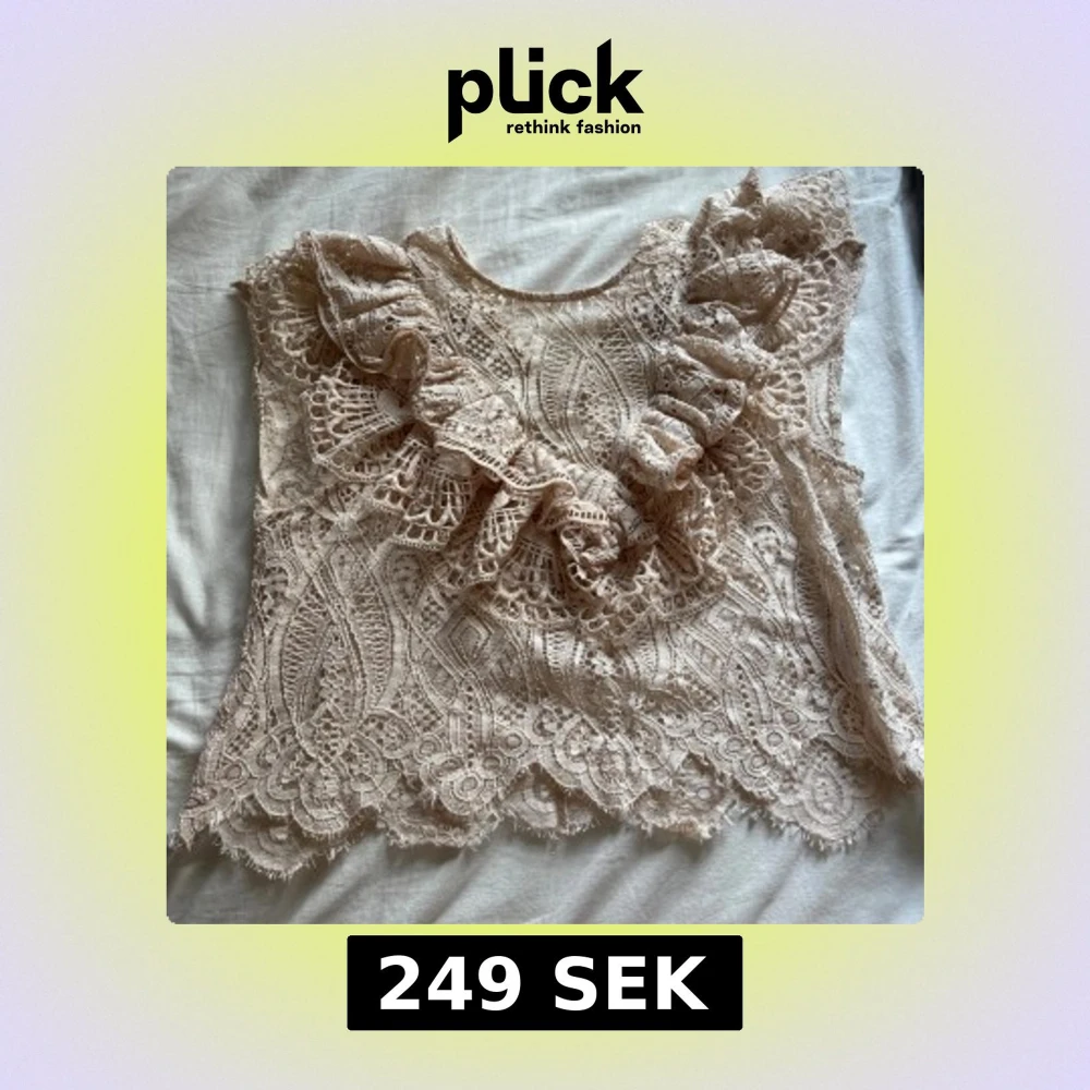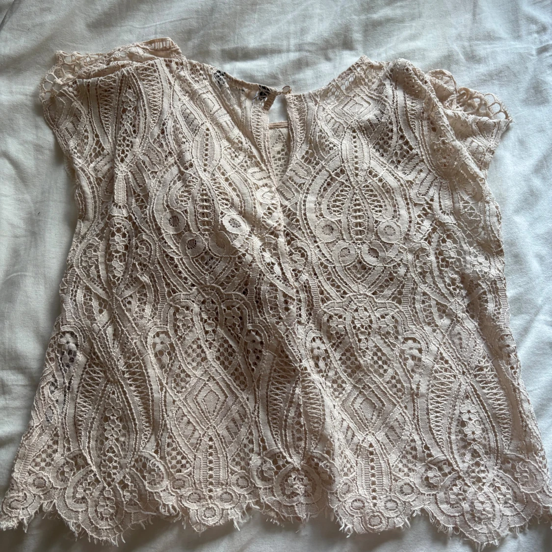Supersöt beige spetsblus från Zara med volangdetaljer framtill och vackert mönstrad spets. Blusen är ärmlös och har en liten knapp i nacken. Perfekt för dig som gillar romantisk och feminin stil.