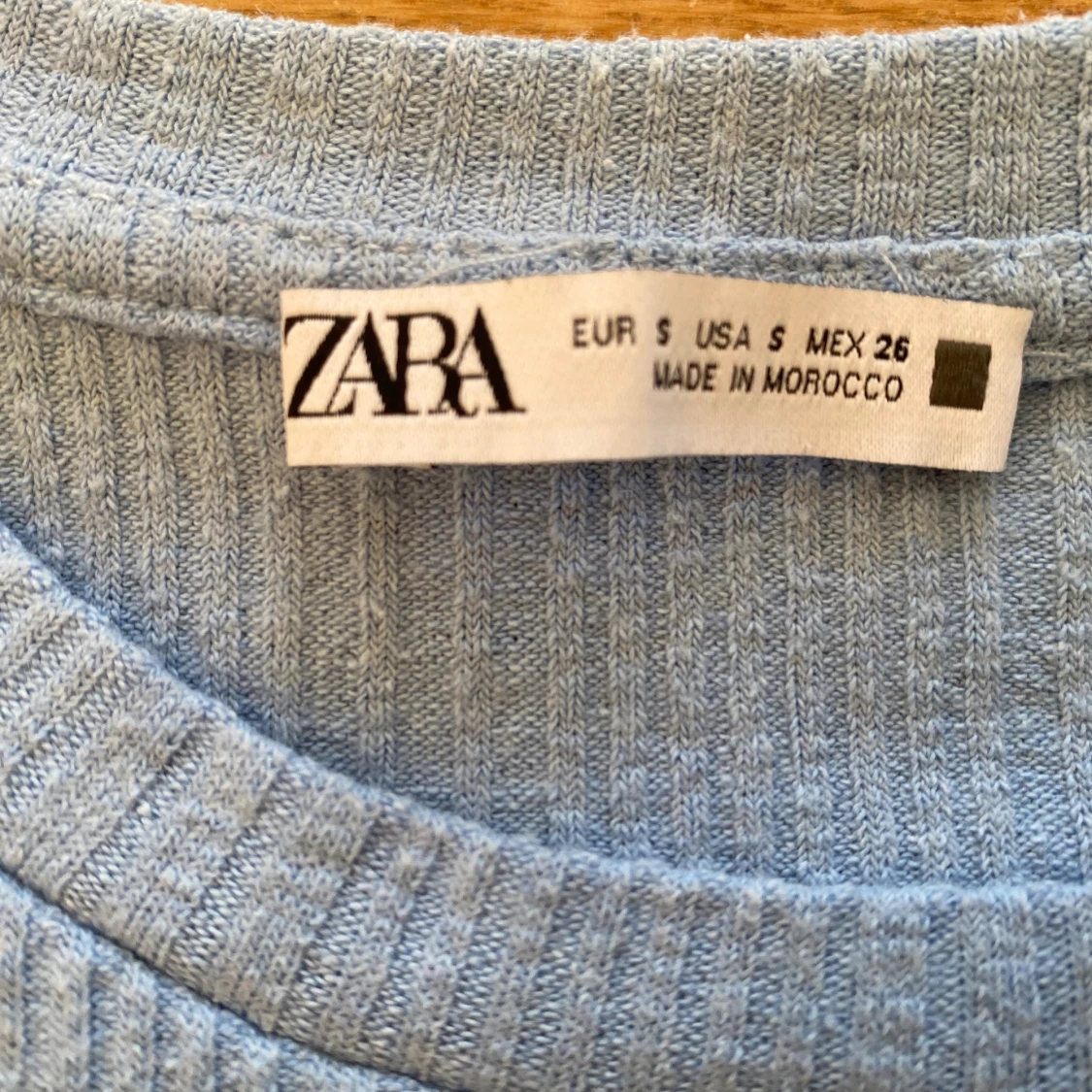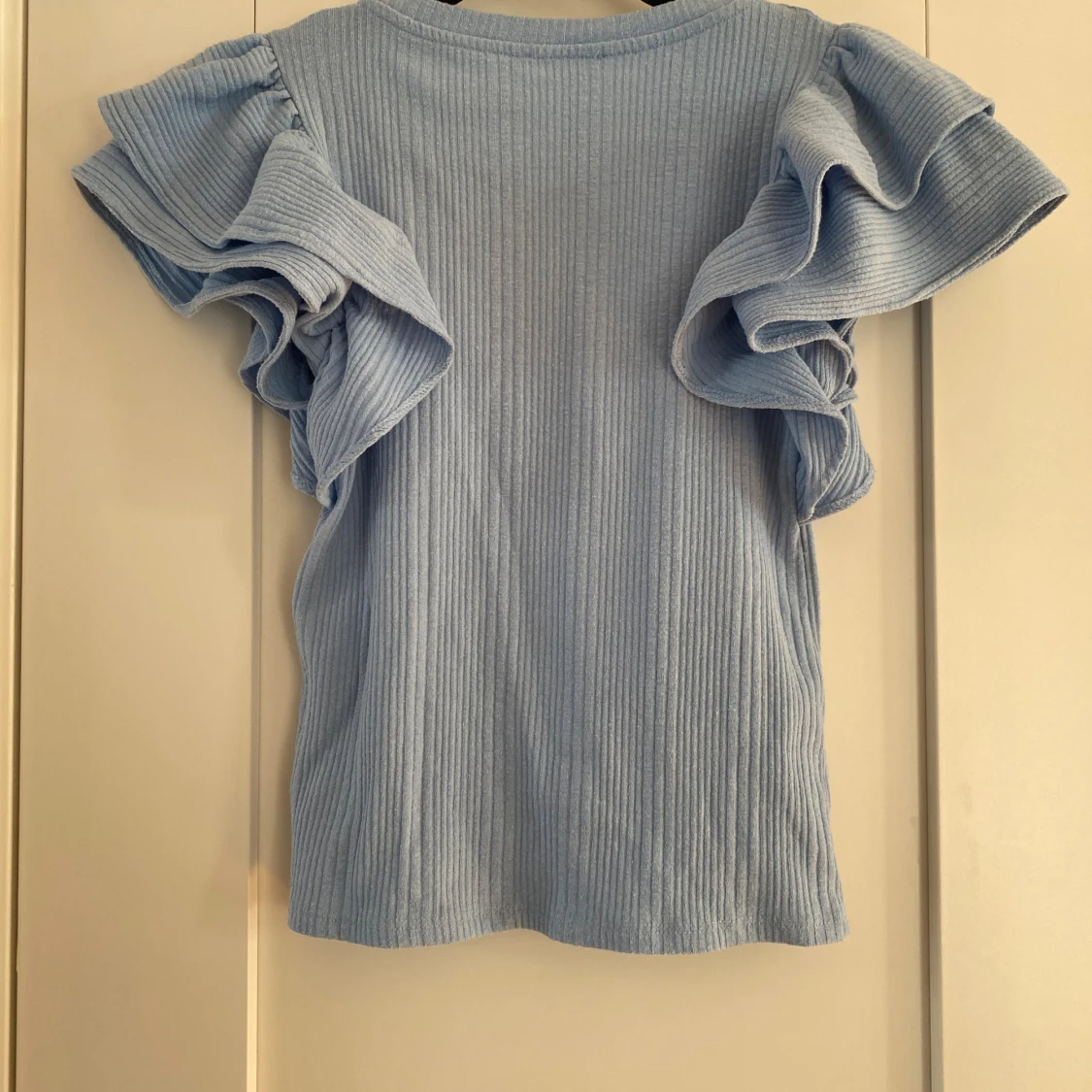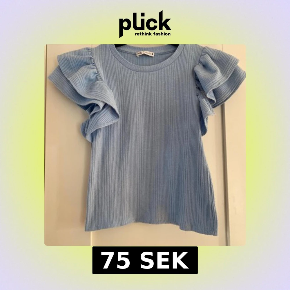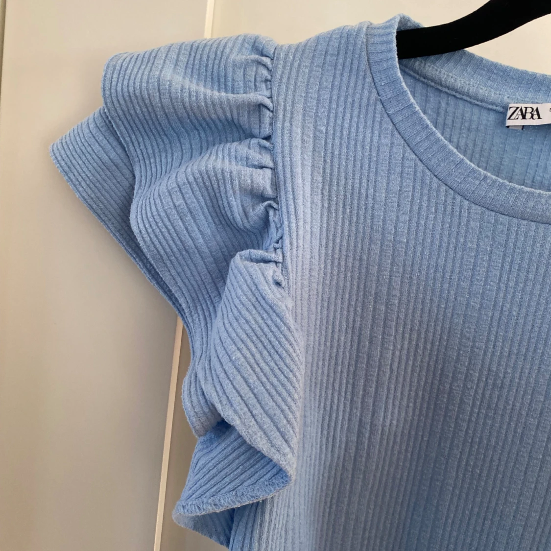 Supersöt ljusblå topp från Zara med ribbad struktur och stora volangärmar. Toppen har rund halsringning och är tillverkad i ett mjukt, stretchigt material som känns skönt mot huden. Perfekt för dig som vill ha en trendig och lekfull look. Mått Över bröstet: ca 35 cm Längd från axeln och ner: ca 49 cm Polyester, bomull och elastan Kommer från ett djur och rökfritt hem.