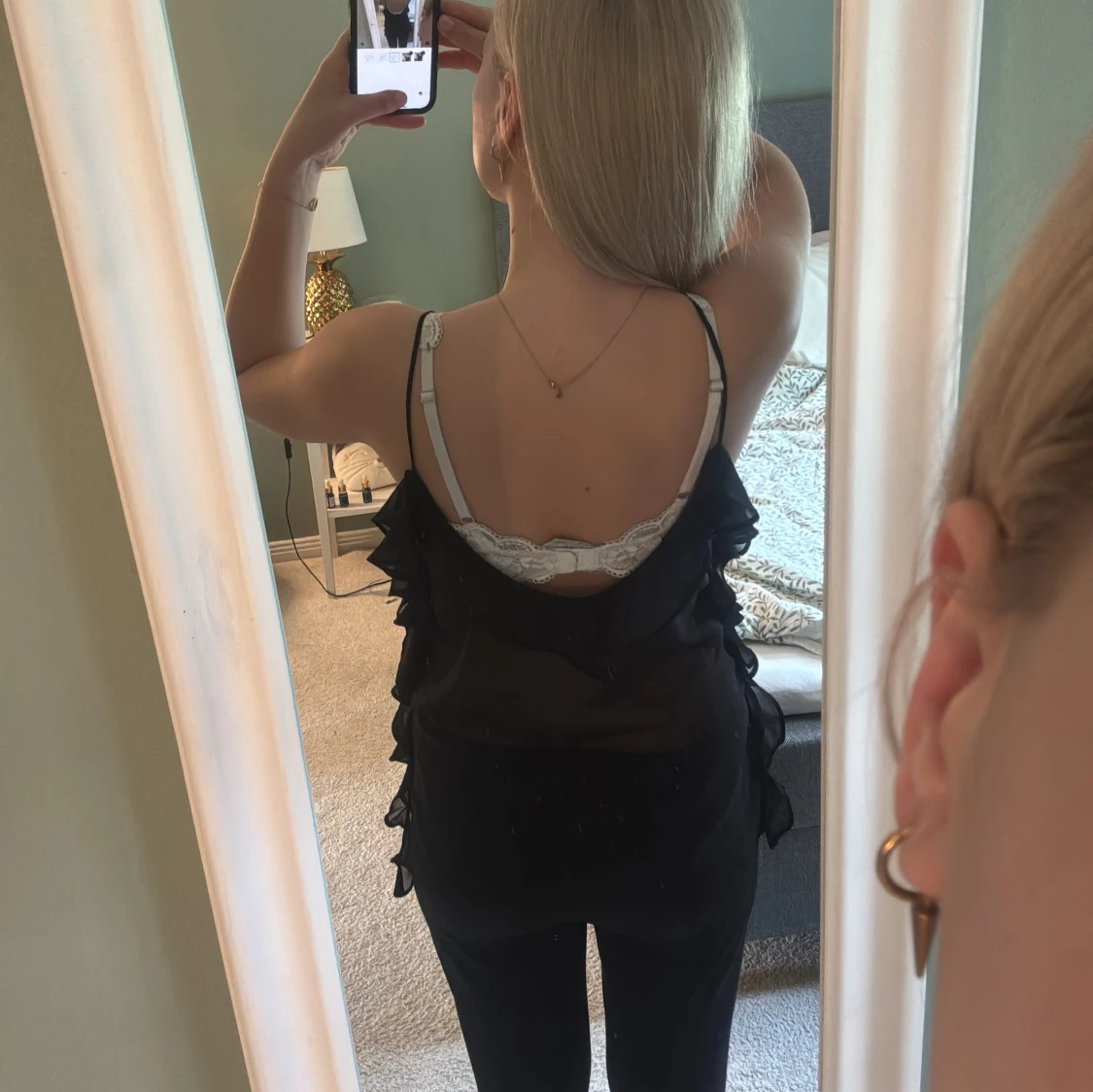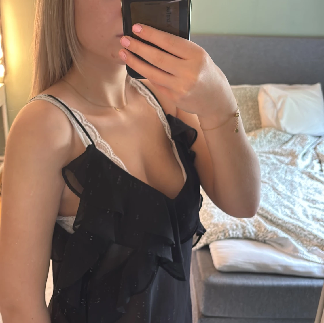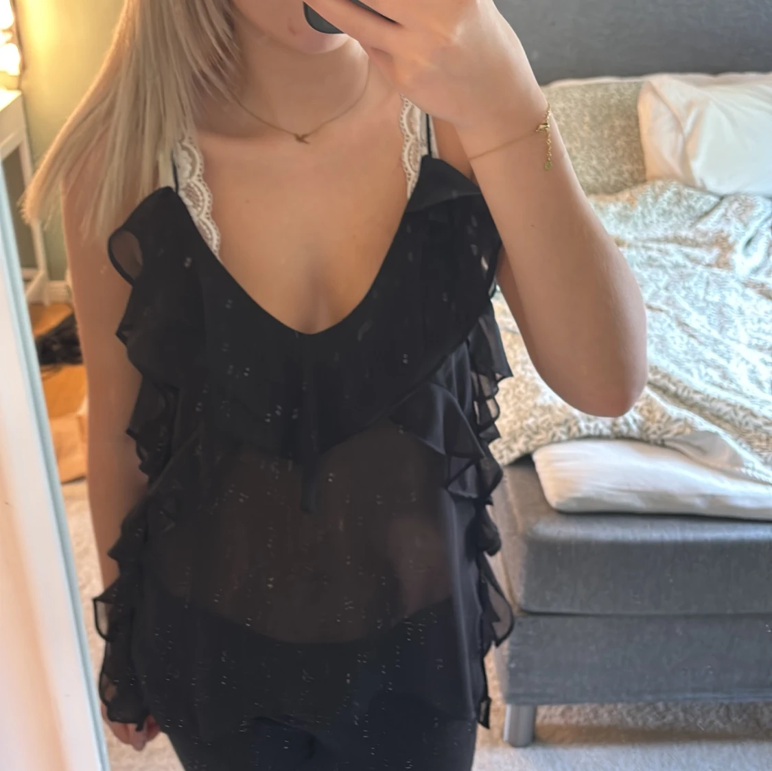 Säljer en svart, transparent linnetopp med tunna axelband och flera lager volanger längs fram- och baksidan. Toppen har en djup v-ringning och är perfekt för dig som gillar en luftig och trendig look. Materialet är lätt och flowy, vilket ger en snygg siluett.