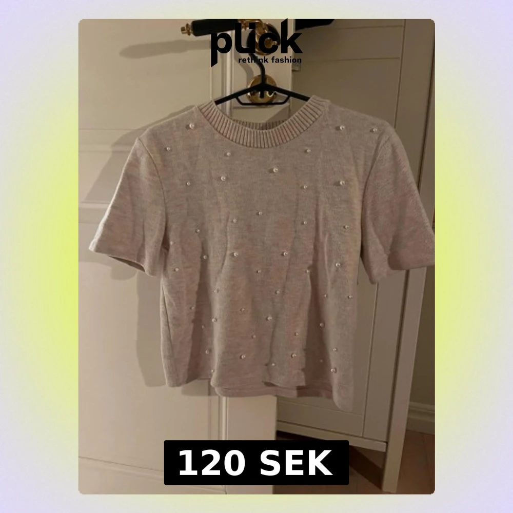 Supersöt ljus beige topp med korta ärmar och rund halsringning och pärlor. Använd väldigt få gånger.