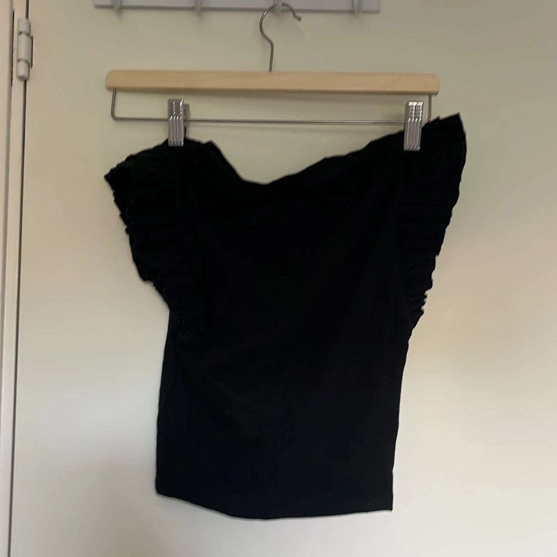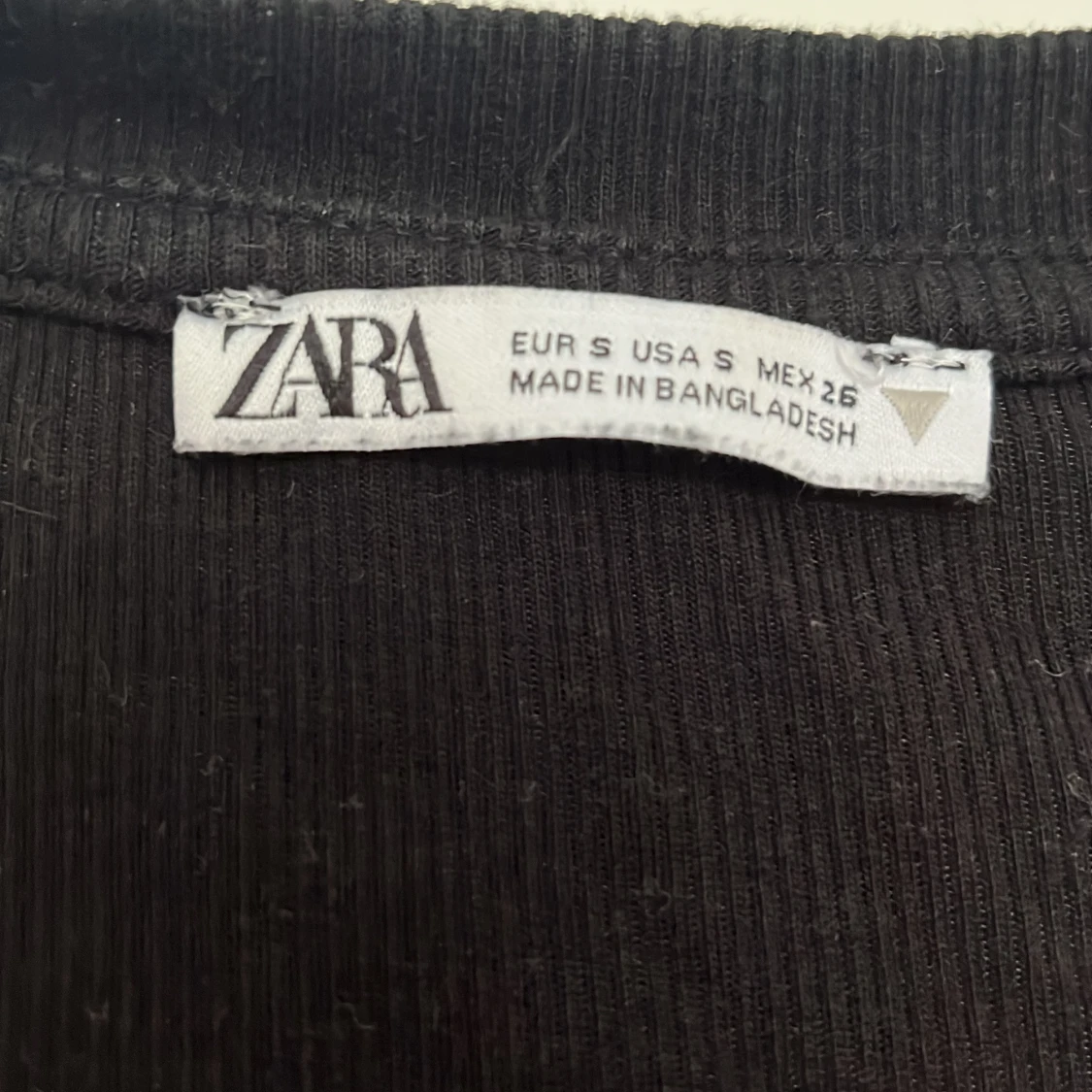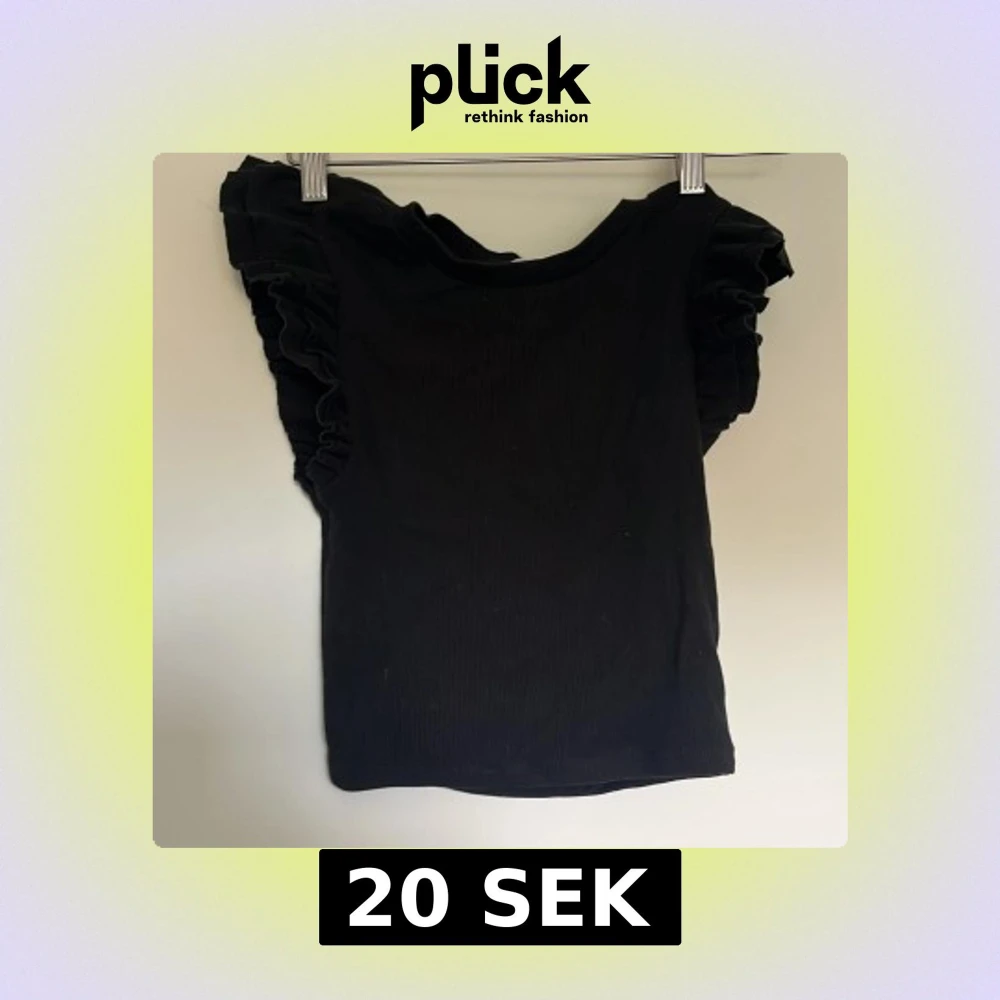 Svart topp från Zara med volangdetaljer längs axlarna. Modellen är ärmlös och har en rund halsringning. Toppens material är ribbad bomull som ger en skön och stretchig känsla. Perfekt för dig som gillar en stilren look med en twist.