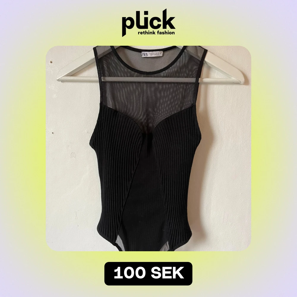 Snygg svart ärmlös topp från Zara med transparent mesh upptill och ribbad design på framsidan. Perfekt för en utekväll eller fest. Toppen har en modern och stilren look som passar till många olika outfits.
